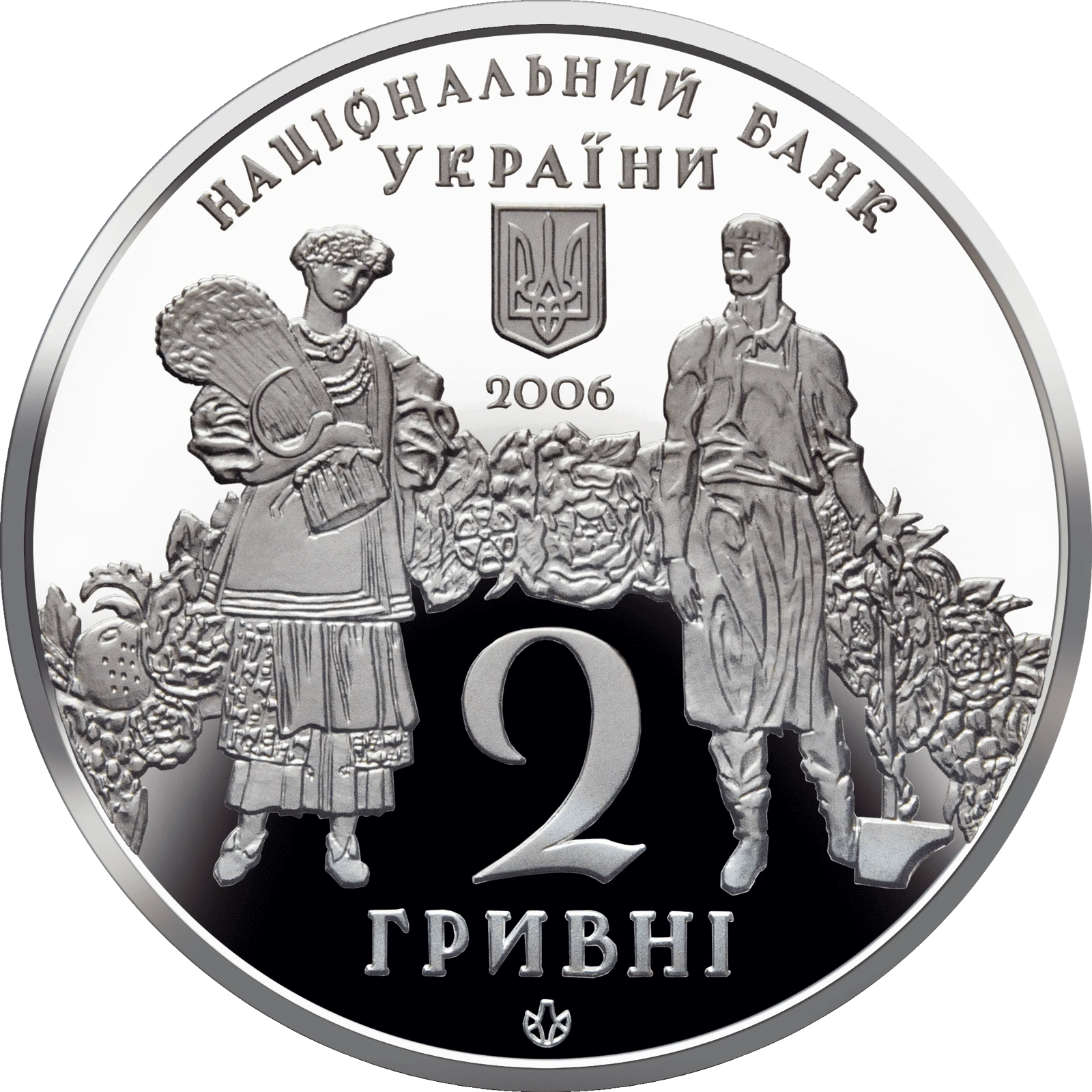 На аверсі монети зображено фрагмент оформлення купюри 1918 року - селянка та робітник на тлі вінка з квітів і плодів, над яким розміщено рік карбування монети 2006, малий Державний Герб України та напис - НАЦІОНАЛЬНИЙ БАНК (півколом)/ УКРАЇНИ; унизу - 2/ ГРИВНІ та логотип Монетного двору Національного банку України.