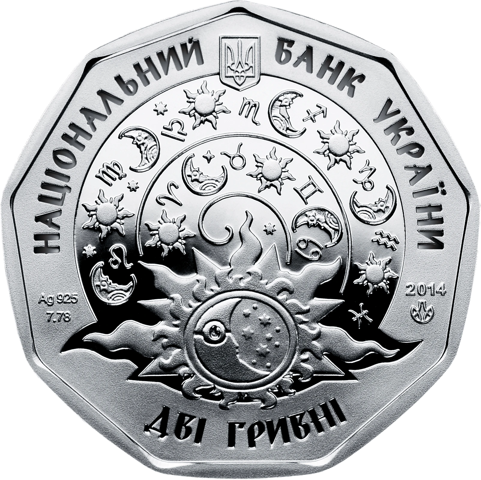 На аверсі монети розміщено: угорі малий Державний Герб України, написи: угорі півколом - НАЦІОНАЛЬНИЙ БАНК УКРАЇНИ, унизу - номінал ДВІ ГРИВНІ та стилізовану композицію - на тлі зіркового неба зображення знаків зодіаку, місяця та сонця; рік карбування монети 2014 та логотип Монетного двору Національного банку України (праворуч), позначення металу, проби та маси Ag 925/7,78 (ліворуч).