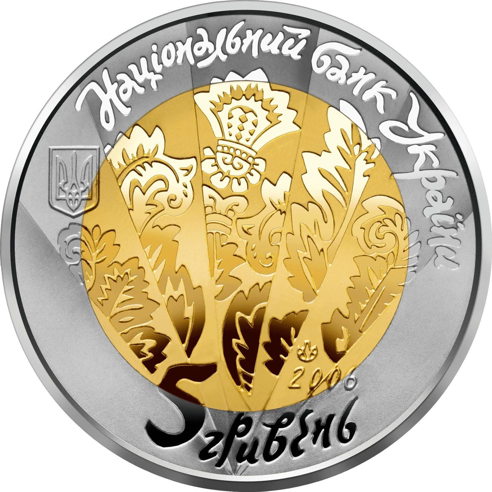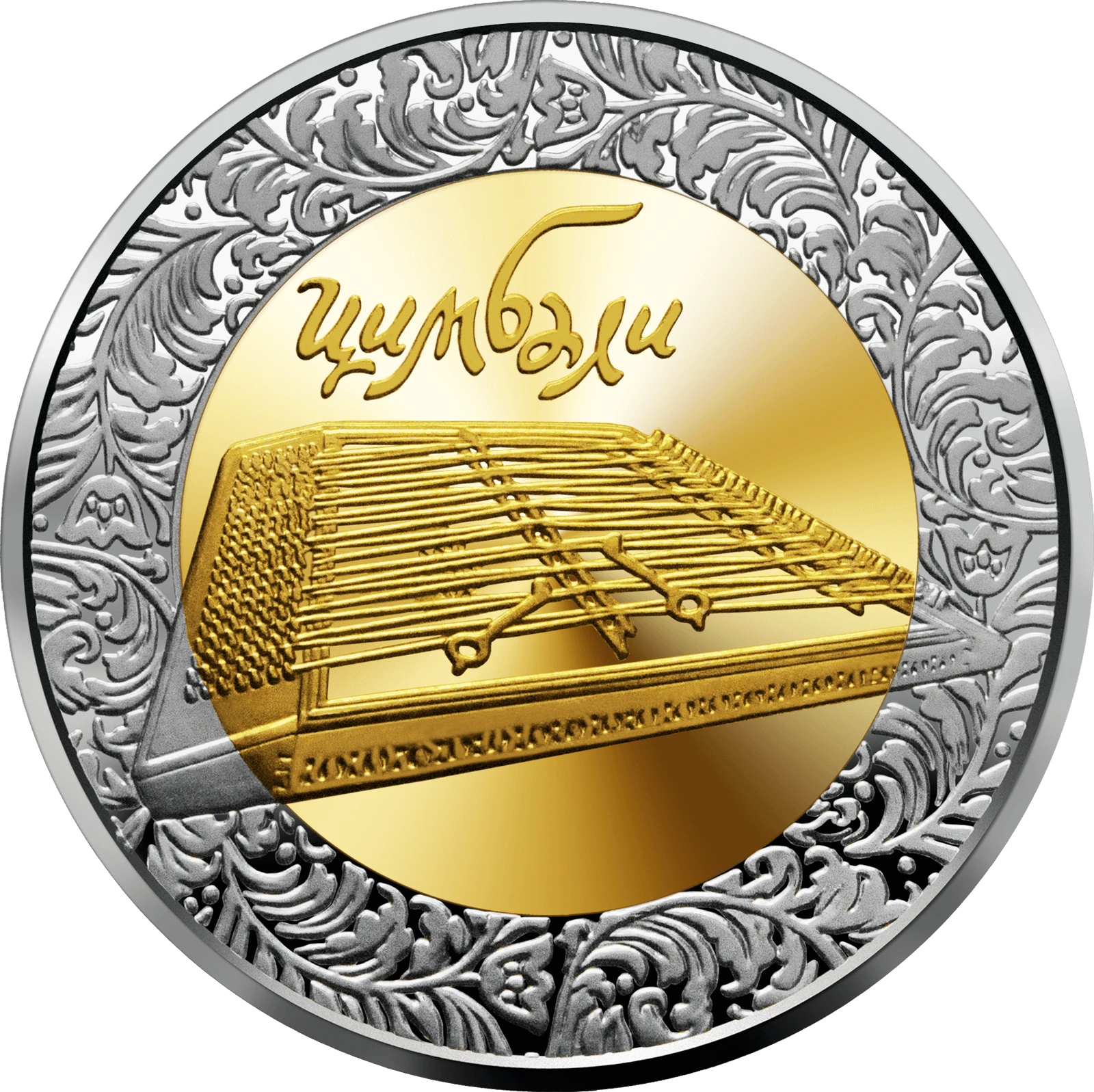 Віялоподібна рельєфна поверхня поля аверсу символічно відтворює мелодію цимбал у вигляді стилізованого барокового орнаменту. Розміщено написи, стилізовані під козацький шрифт, НАЦІОНАЛЬНИЙ БАНК УКРАЇНИ (угорі), 2006/ 5/ ГРИВЕНЬ (унизу) та логотип Монетного двору Національного банку України.