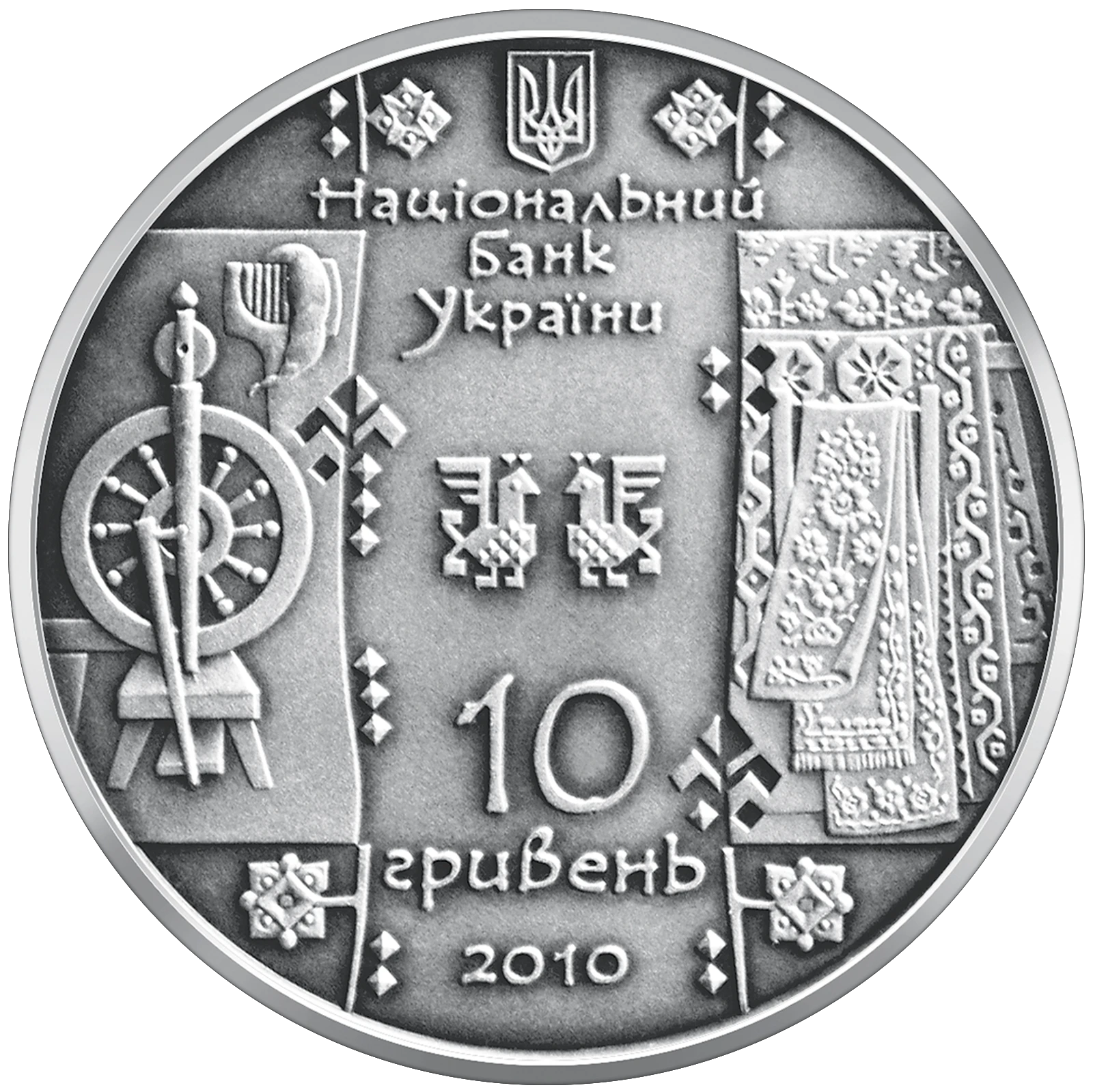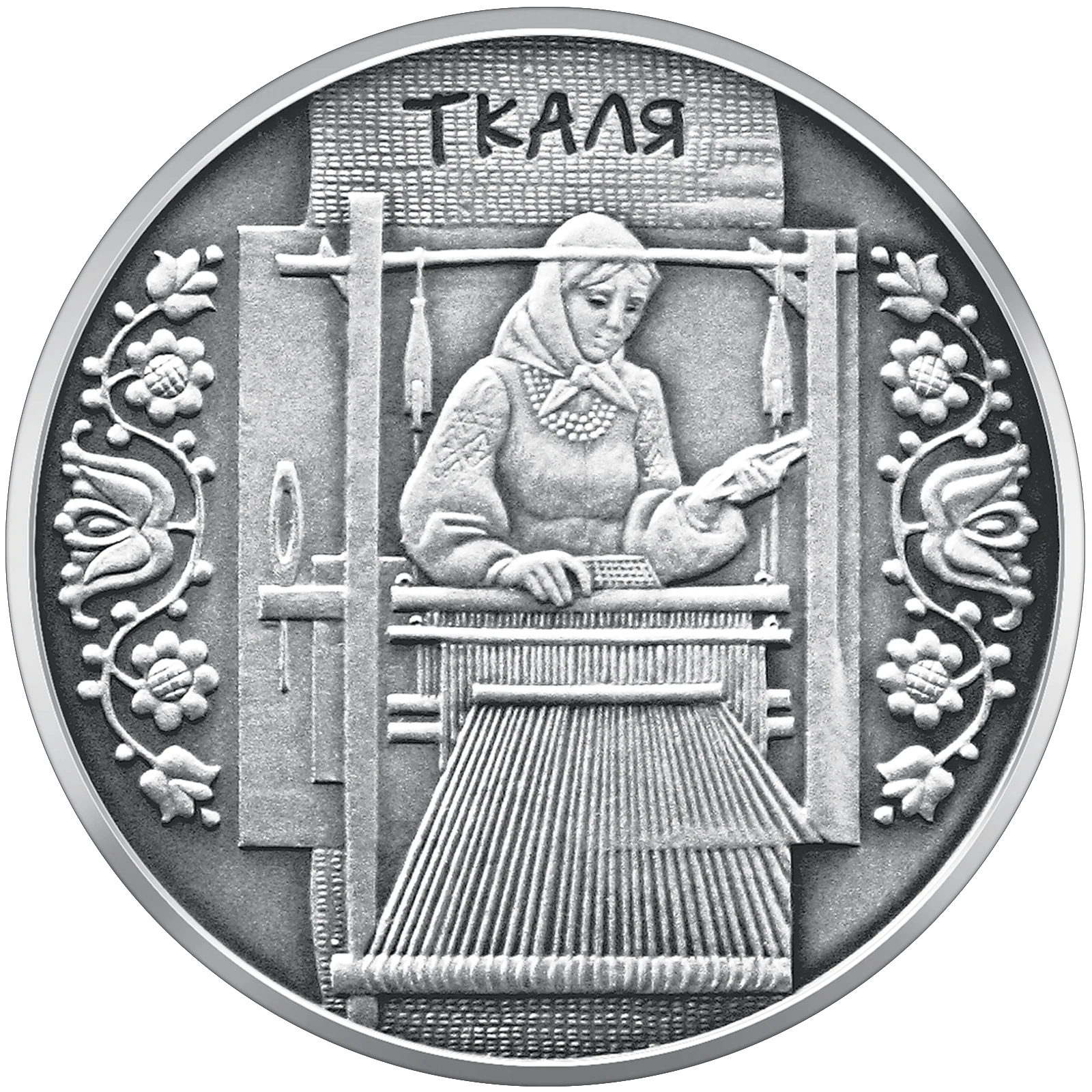 Присвячена одному з найважливіших видів господарської діяльності та мистецької культури українців, що був невід`ємною частиною домашніх занять кожної селянської сім`ї - ткацтву. З давніх часів на території України займалися обробленням волокна з льону, конопель і вовни. Монету виготовлено з використанням технології патинування.
