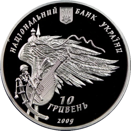 На аверсі монети на тлі крила (алегорії перемоги) зображено гетьманські клейноди, козацьку зброю та бандуру, угорі розміщено малий Державний Герб України і напис півколом НАЦІОНАЛЬНИЙ БАНК УКРАЇНИ, унизу - номінал 10/ГРИВЕНЬ та рік карбування монети 2009.