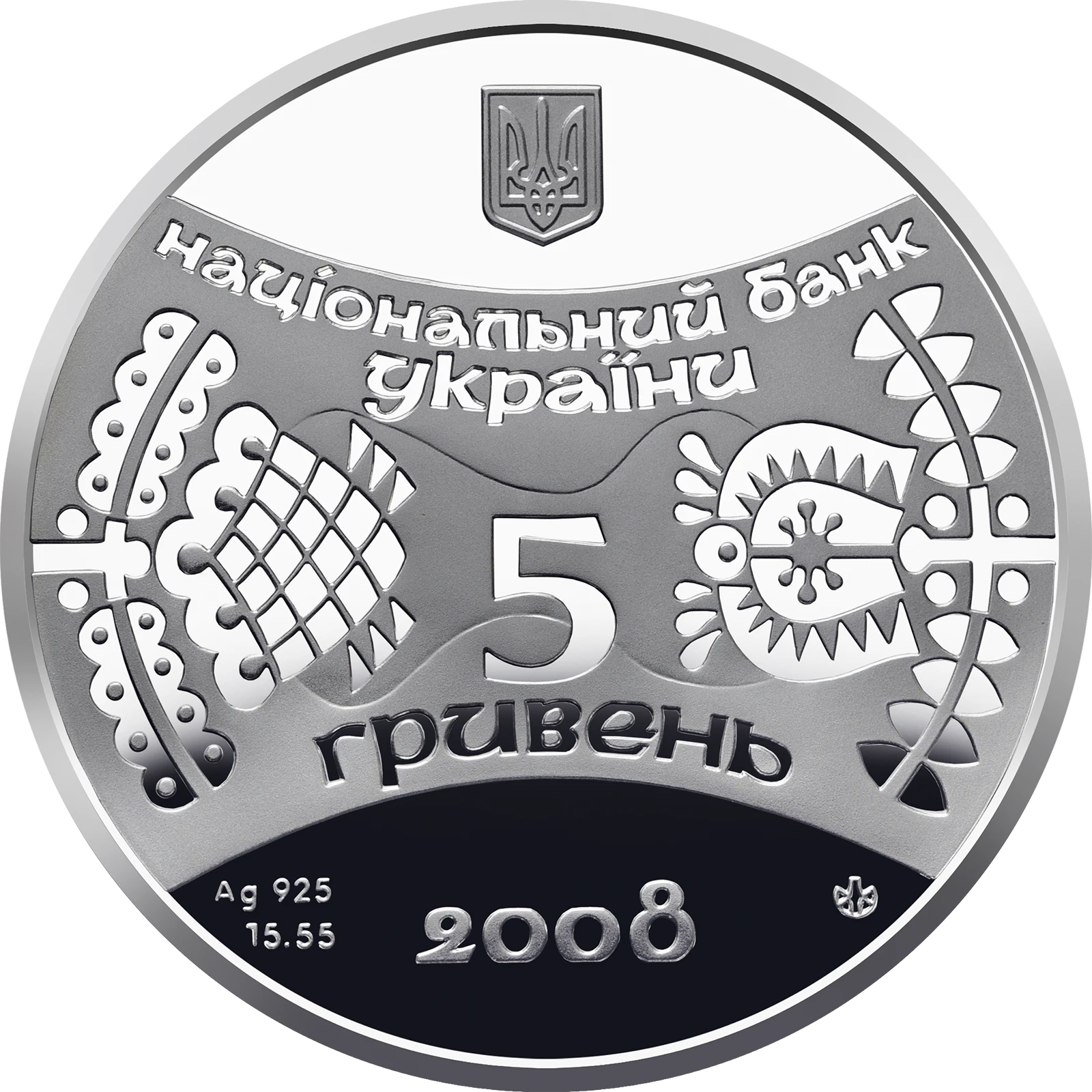 На аверсі монети в оточенні стилізованого рослинного орнаменту розміщено написи: НАЦІОНАЛЬНИЙ БАНК/ УКРАЇНИ/ 5/ ГРИВЕНЬ; угорі - малий Державний Герб України, унизу - рік карбування монети 2008, а також позначення металу, його проби - Ag 925, маси в чистоті - 15,55 та логотип Монетного двору Національного банку України.