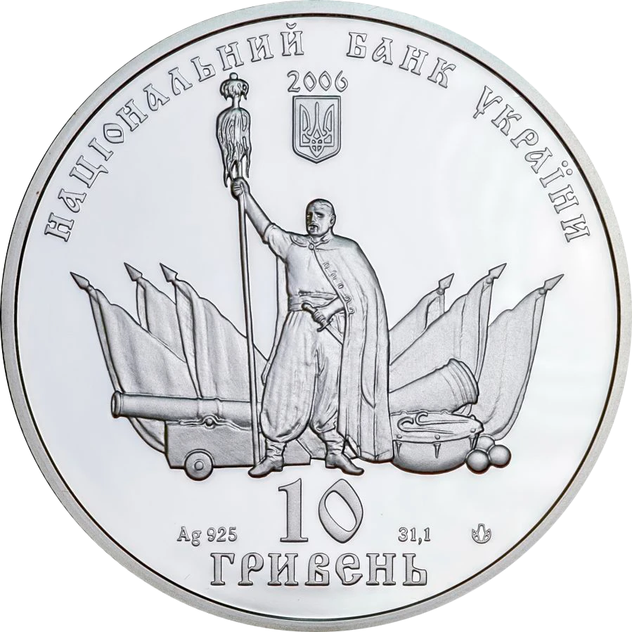 На аверсі монети зображено козака з бунчуком на тлі козацьких корогов, гармат, литаврів, над ним - малий Державний Герб України, рік карбування монети 2006 і розміщено написи: НАЦІОНАЛЬНИЙ БАНК УКРАЇНИ (угорі півколом), 10/ ГРИВЕНЬ (унизу), а також позначення металу, його проби - Ag 925, маси в чистоті - 31,1 та логотип Монетного двору Національного банку України.