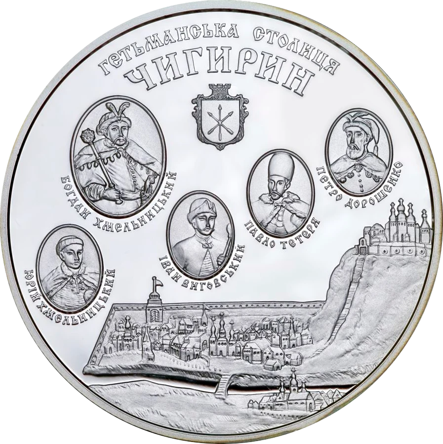 На реверсі монети зображено п`ять портретів у медальонах, під якими півколом розміщено написи: БОГДАН ХМЕЛЬНИЦЬКИЙ, ЮРІЙ ХМЕЛЬНИЦЬКИЙ, ІВАН ВИГОВСЬКИЙ, ПАВЛО ТЕТЕРЯ, ПЕТРО ДОРОШЕНКО, над портретами - герб міста та у два рядки написи -ГЕТЬМАНСЬКА СТОЛИЦЯ/ ЧИГИРИН; унизу - вид Чигирина (фрагмент малюнка з літопису Самійла Величка).