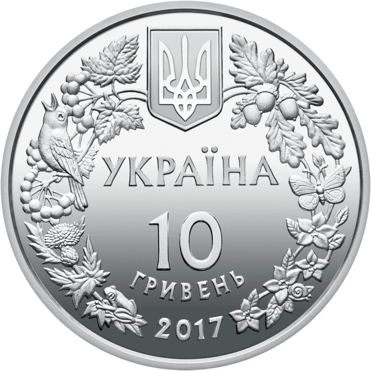 На аверсі монети в обрамленні вінка, утвореного із зображень окремих видів флори і фауни, розміщено малий Державний Герб України та написи: УКРАЇНА/10/ГРИВЕНЬ/2017.