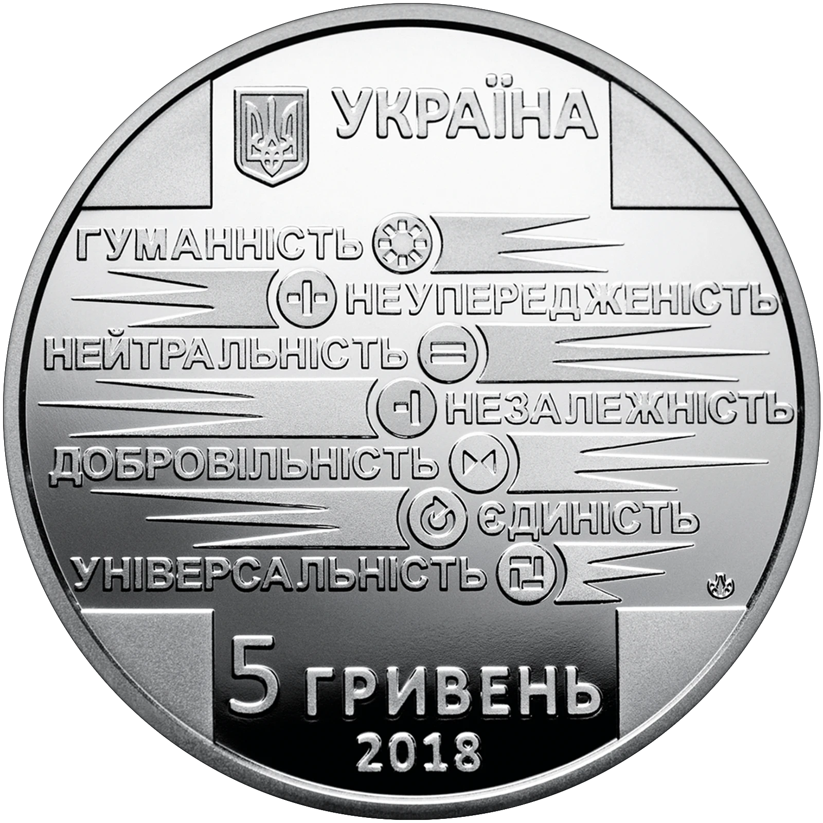Всі оголошення про продаж монети на нашому сайтіНа аверсі монети на дзеркальному тлі стилізованого хреста розміщено: угорі малий Державний Герб України та напис УКРАЇНА; принципи та цінності, якими керується Міжнародний рух Червоного Хреста і Червоного Півмісяця - ГУМАННІСТЬ/ НЕУПЕРЕДЖЕНІСТЬ/ НЕЙТРАЛЬНІСТЬ/ НЕЗАЛЕЖНІСТЬ/ ДОБРОВІЛЬНІСТЬ/ ЄДИНІСТЬ/ УНІВЕРСАЛЬНІСТЬ; унизу: номінал 5/ГРИВЕНЬ та рік карбування монети ? 2018, логотип Банкнотно-монетного двору Національного банку України (праворуч).