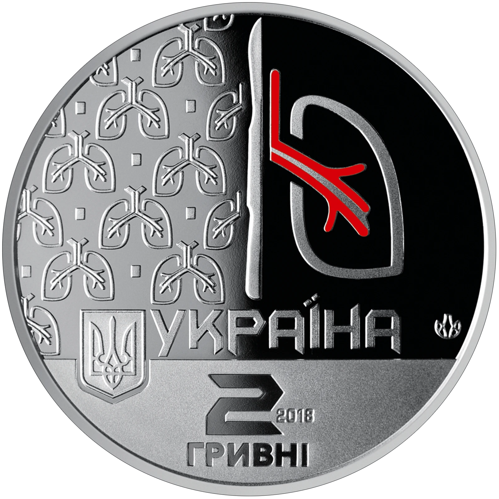 На аверсі монети розміщено: на дзеркальному тлі стилізовану композицію, що символізує торакальну хірургію, один з елементів композиції - кольоровий (використано тамподрук); унизу: малий Державний Герб України, напис УКРАЇНА; під ними: номінал - 2/ГРИВНІ та рік карбування монети - 2018; логотип Банкнотно-монетного двору Національного банку України (праворуч).