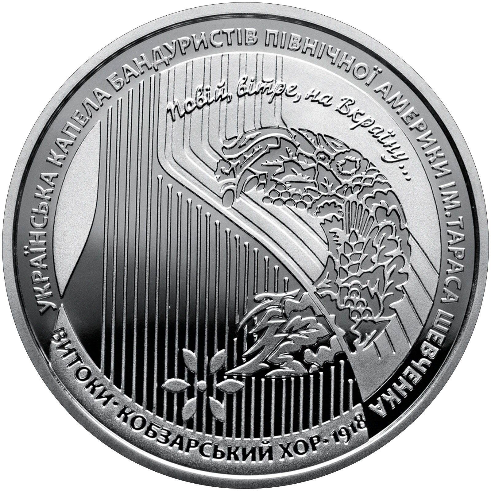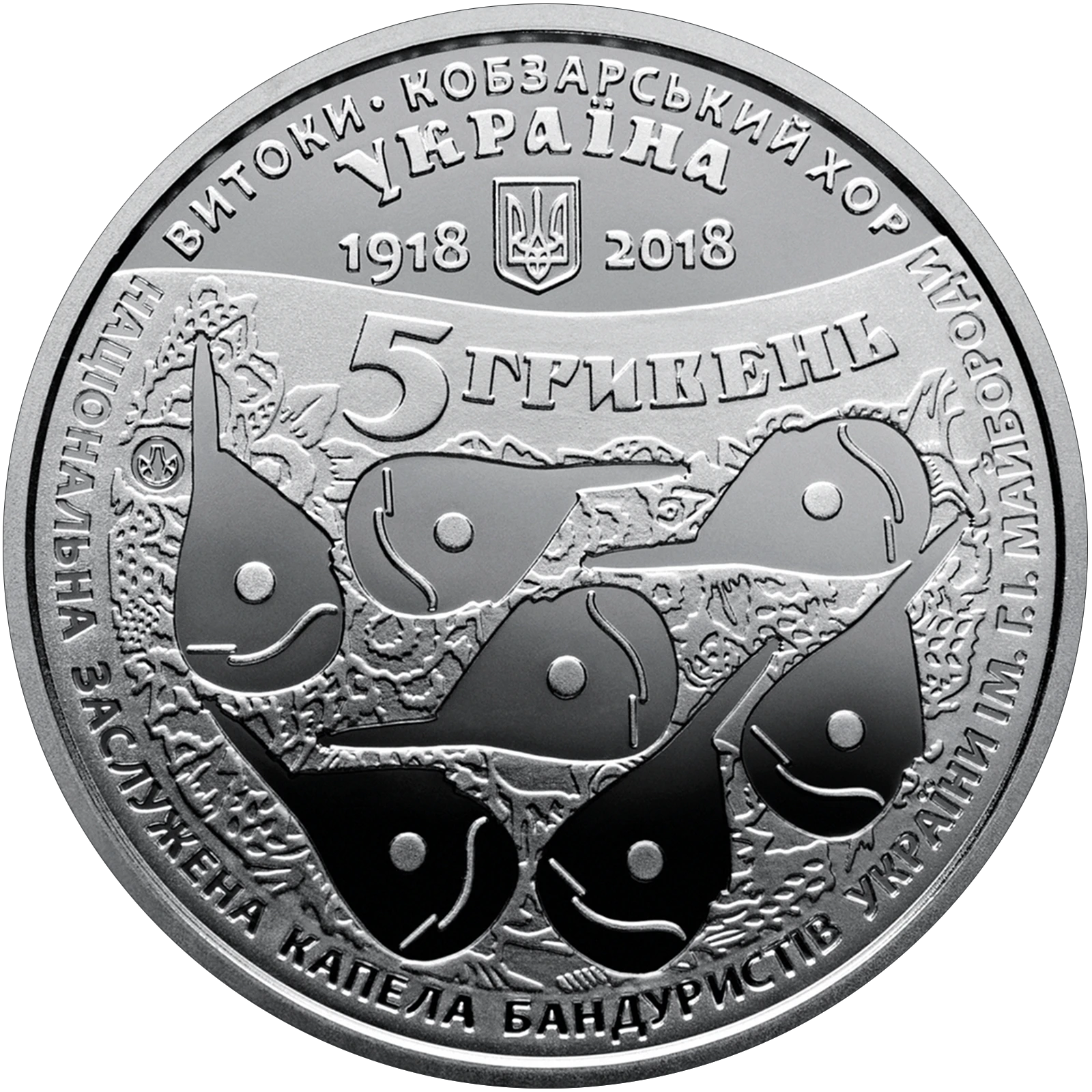 Всі оголошення про продаж монети на нашому сайтіНа аверсі монети розміщено: угорі на дзеркальному тлі напис УКРАЇНА, під яким - малий Державний Герб України, по обидва боки від якого роки: 1918 та 2018, на рельєфному тлі номінал монети - 5 ГРИВЕНЬ, під яким стилізована композиція: на тлі квіткового орнаменту - сім бандур; по колу написи: ВИТОКИ o КОБЗАРСЬКИЙ ХОР (угорі); НАЦІОНАЛЬНА ЗАСЛУЖЕНА КАПЕЛА БАНДУРИСТІВ УКРАЇНИ ІМ. Г. І. МАЙБОРОДИ; логотип Банкнотно-монетного двору Національного банку України (ліворуч).
