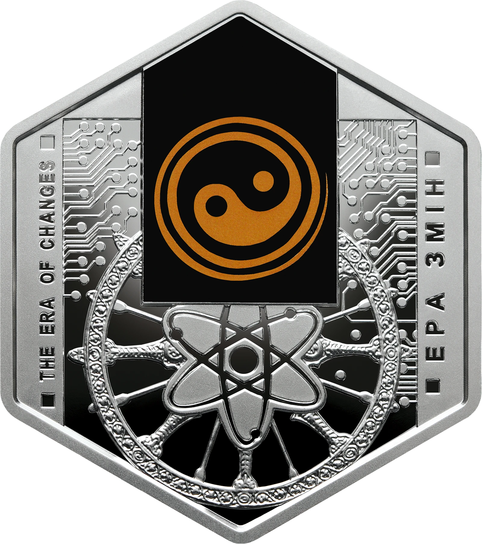 На реверсі монети розміщено: на тлі мікросхем композицію: на чорному тлі зображено кольоровий давній символ `Інь-Янь` (використано тамподрук), під яким архаїчне колесо - символ сонця, життєвого циклу, оновлення, мінливості, у центрі якого - атом, що символізує досягнення науки і техніки; вертикальні написи: THE ERA OF CHANGES (ліворуч) та ЕРА ЗМІН (праворуч).