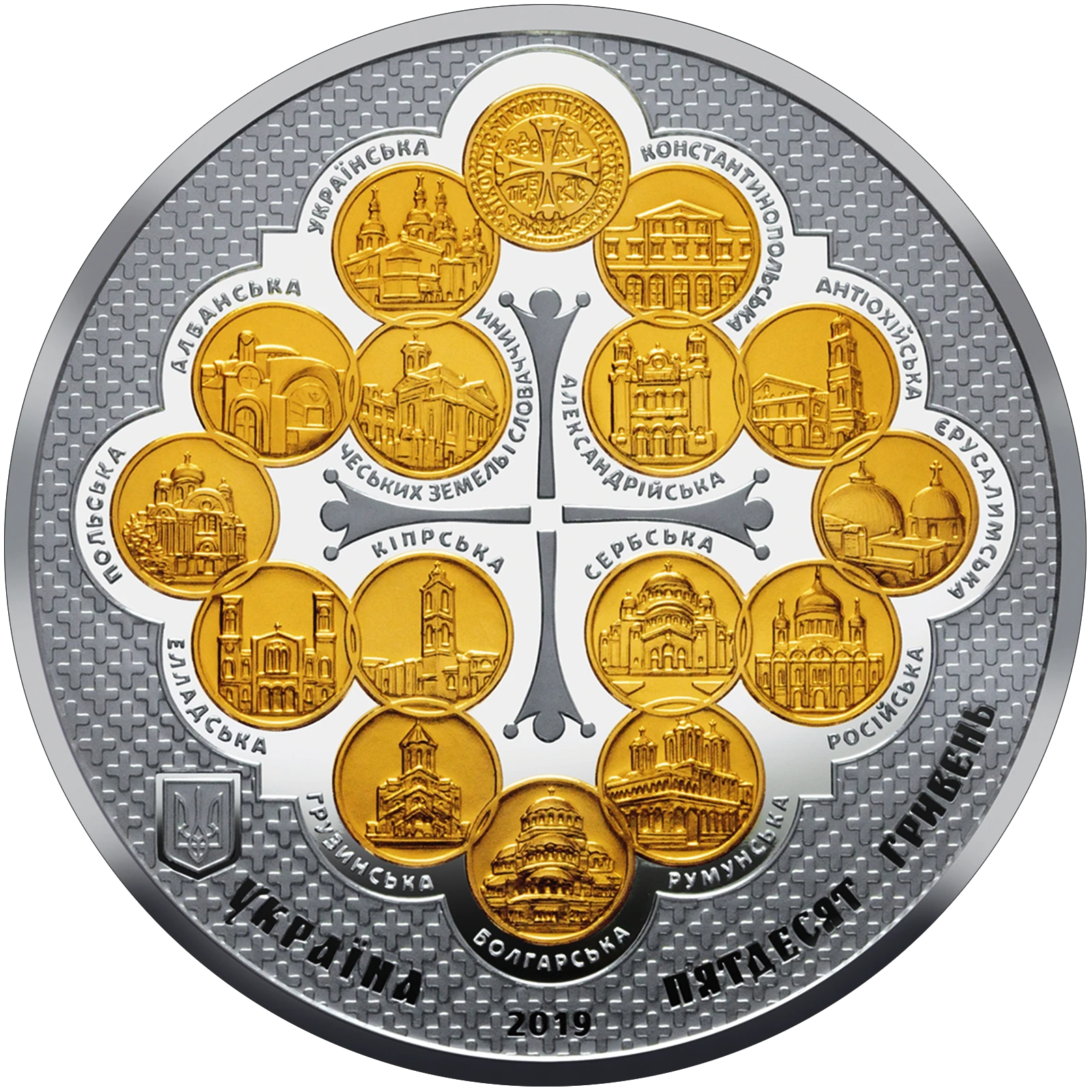 Поки що немає жодного оголошення. Виставити на продажНа аверсі монети розміщено: унизу: малий Державний Герб України (ліворуч), півколом написи: УКРАЇНА, рік карбування монети 2019 та номінал П’ЯТДЕСЯТ ГРИВЕНЬ; у центрі – стилізована хрестоподібна композиція, увінчана позолоченим відбитком печатки Вселенського Патріарха Варфоломія, довкола на позолочених медальйонах зображені кафедральні собори помісних православних церков світу, поруч зазначені їхні назви: угорі КОНСТАНТИНОПОЛЬСЬКА, під нею АЛЕКСАНДРІЙСЬКА, праворуч АНТІОХІЙСЬКА, під нею ЄРУСАЛИМСЬКА (праворуч), під нею РОСІЙСЬКА, ліворуч СЕРБСЬКА, під нею РУМУНСЬКА, унизу БОЛГАРСЬКА, ліворуч ГРУЗИНСЬКА, над нею КІПРСЬКА, ліворуч ЕЛЛАДСЬКА, угорі ПОЛЬСЬКА, над нею АЛБАНСЬКА, праворуч ЧЕСЬКИХ ЗЕМЕЛЬ І СЛОВАЧЧИНИ, над нею УКРАЇНСЬКА.