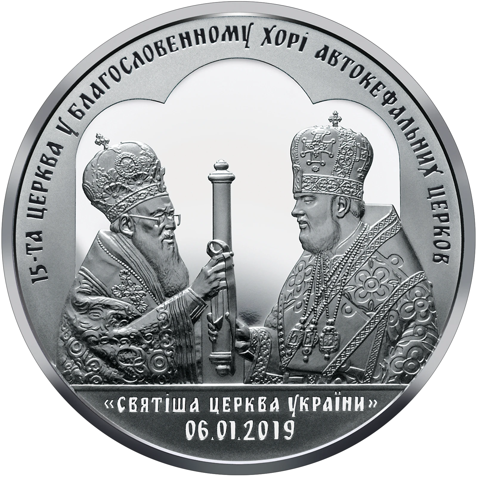 На реверсі монети на дзеркальному тлі зображено Вселенського Патріарха Варфоломія (ліворуч), який передає сувій (Томос) Митрополиту Київському і всієї України Епіфанію (праворуч) та написи: 15-ТА ЦЕРКВА У БЛАГОСЛОВЕННОМУ ХОРІ АВТОКЕФАЛЬНИХ ЦЕРКОВ (півколом угорі) та «СВЯТІША ЦЕРКВА УКРАЇНИ»/06.01.2019 (унизу).