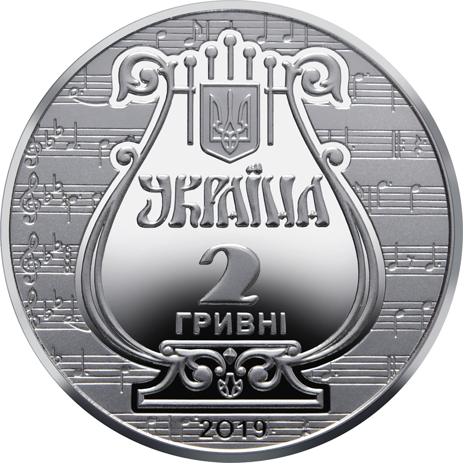 Всі оголошення про продаж монети на нашому сайтіНа аверсі монети розміщено стилізовану композицію: на тлі нотних рядків зображено музичний інструмент – ліру, угорі якої – малий Державний Герб України, під ним написи: УКРАЇНА/2/ГРИВНІ; унизу: логотип Банкнотно-монетного двору Національного банку України та рік карбування монети – 2019.