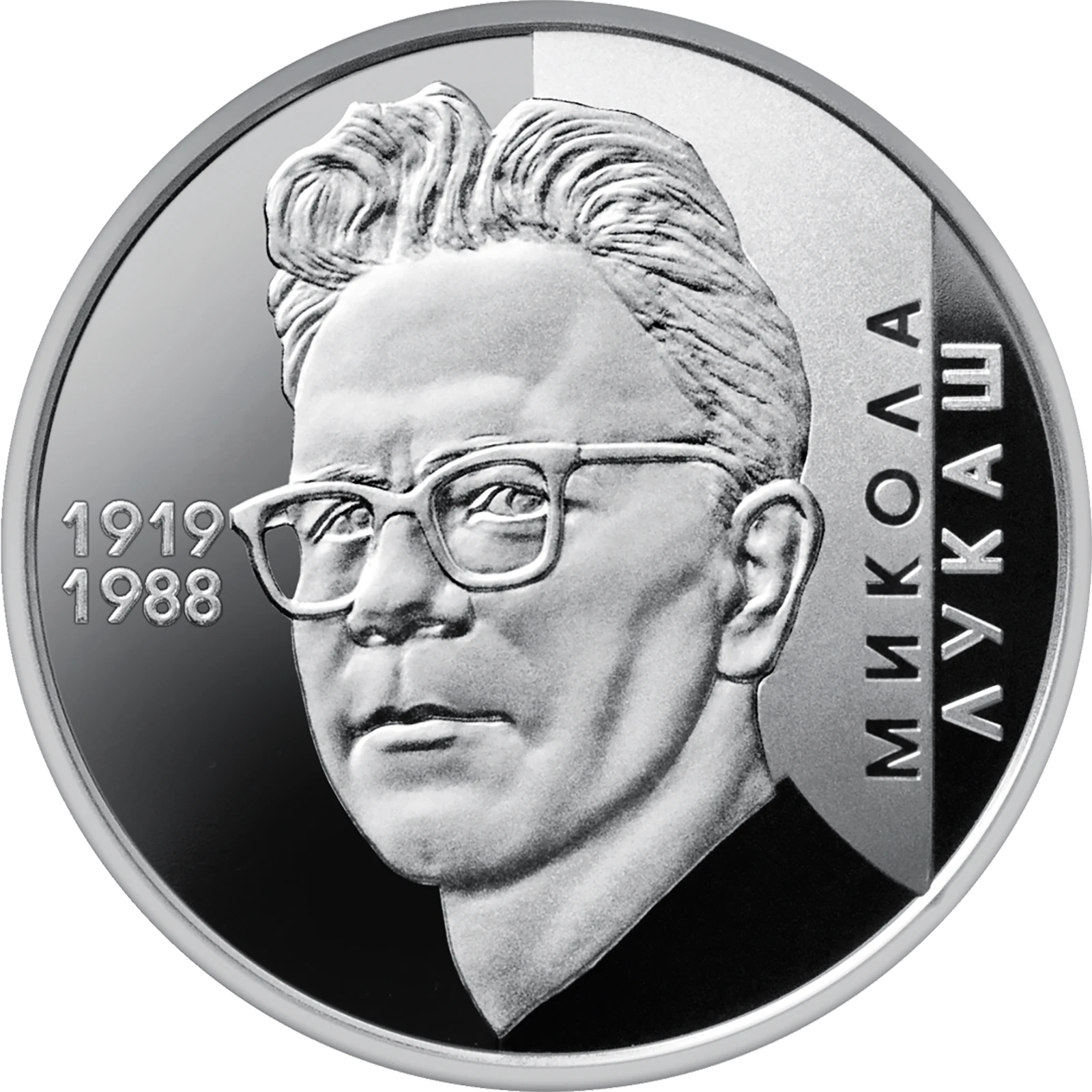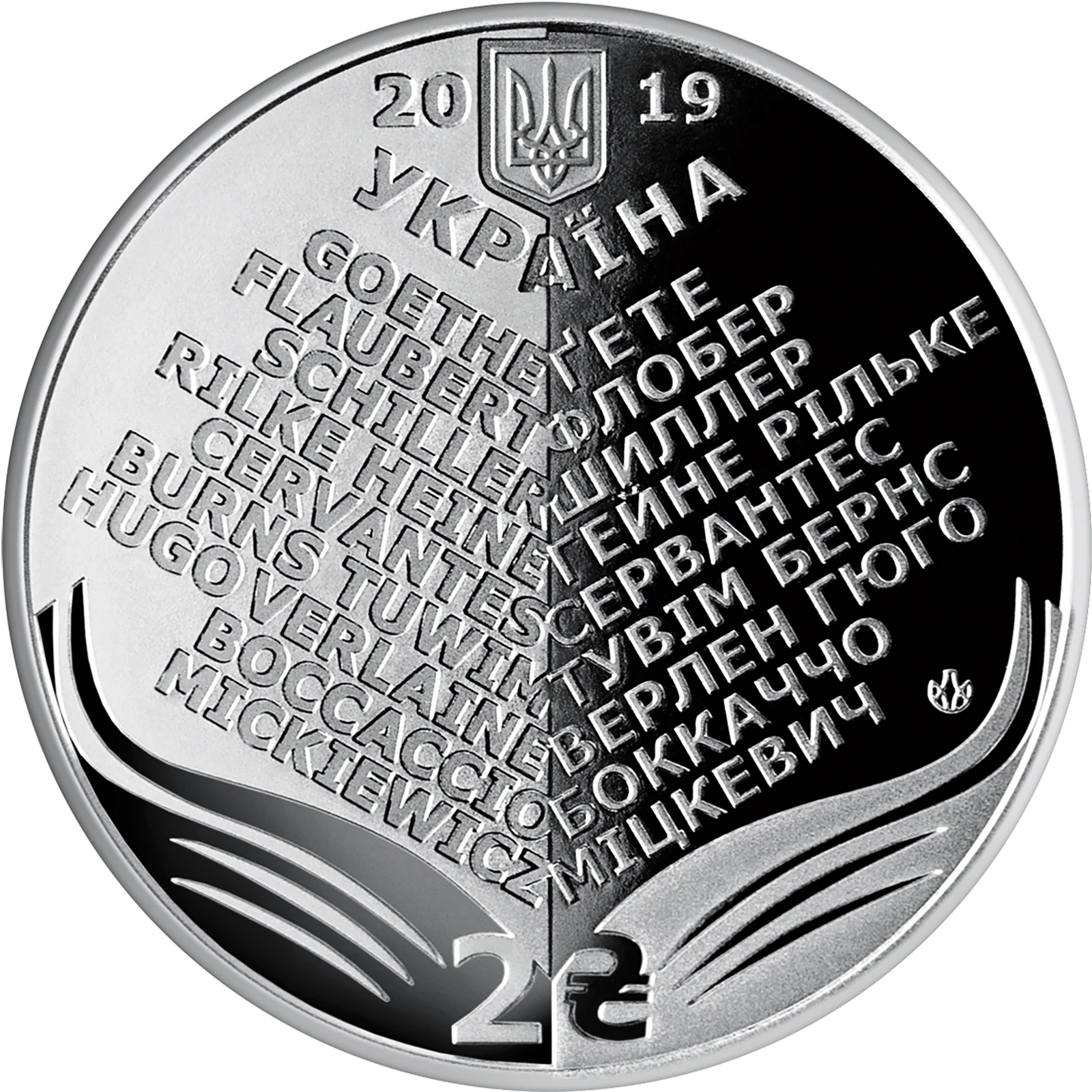 На аверсі монети розміщено: угорі – малий Державний Герб України, праворуч та ліворуч від якого зазначені цифри 20 19, під гербом напис УКРАЇНА; унизу номінал – 2 ?; стилізовану композицію, що символізує книгу перекладів Миколи Лукаша – ліворуч на матовому тлі зазначені автори: GOETHE/FLAUBERT/SCHILLER/RILKE HEINE/CERVANTES/BURNS TUWIM/HUGO VERLAINE/BOCCACCIO/MICKIEWICZ, праворуч, на дзеркальному тлі – ҐЕТЕ/ФЛОБЕР/ШИЛЛЕР/ГЕЙНЕ РІЛЬКЕ/СЕРВАНТЕС/ТУВІМ БЕРНС/ВЕРЛЕН ГЮГО /БОККАЧЧО/МІЦКЕВИЧ. Праворуч на дзеркальному тлі розміщено логотип Банкнотно-монетного двору Національного банку України.