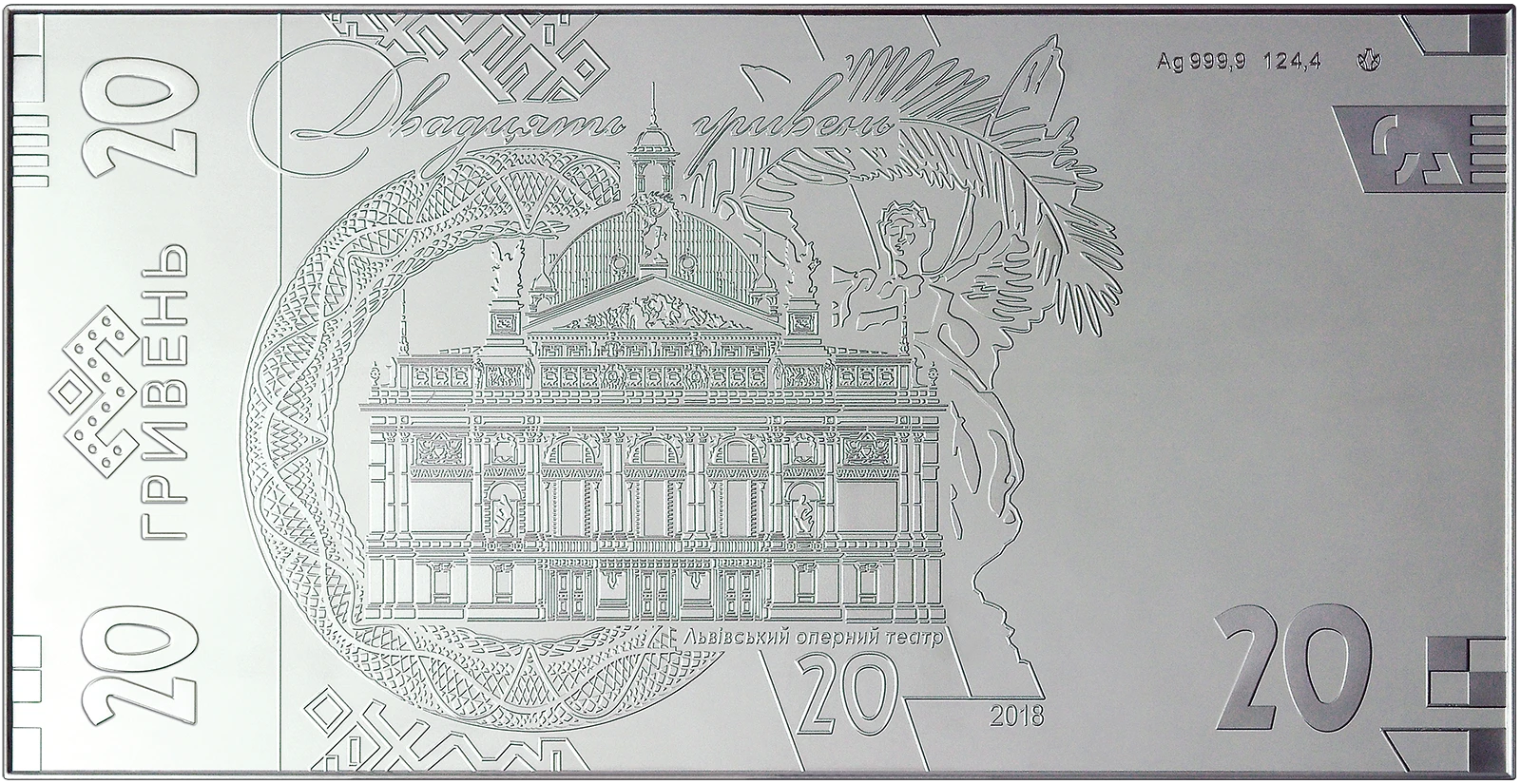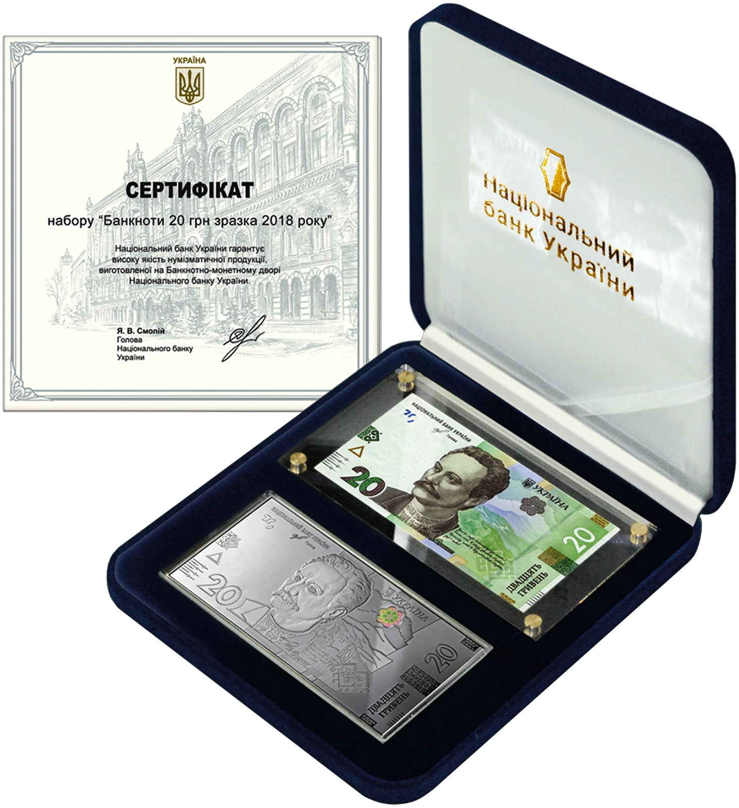 Колекційний набір `Банкноти 20 гривень зразка 2018 року` містить: сувенірну банкноту зі срібла, яка відтворює дизайн банкноти номіналом 20 гривень зразка 2018 року, виготовлену зі срібла 999,9 проби, маса в чистоті - не менше 124,4 г, розміри: 133 х 66 х 1,35 мм; елемент оздоблення - голограма; паперову банкноту номіналом 20 гривень зразка 2018 року (в оргсклі), розміри 69 х 130 мм.