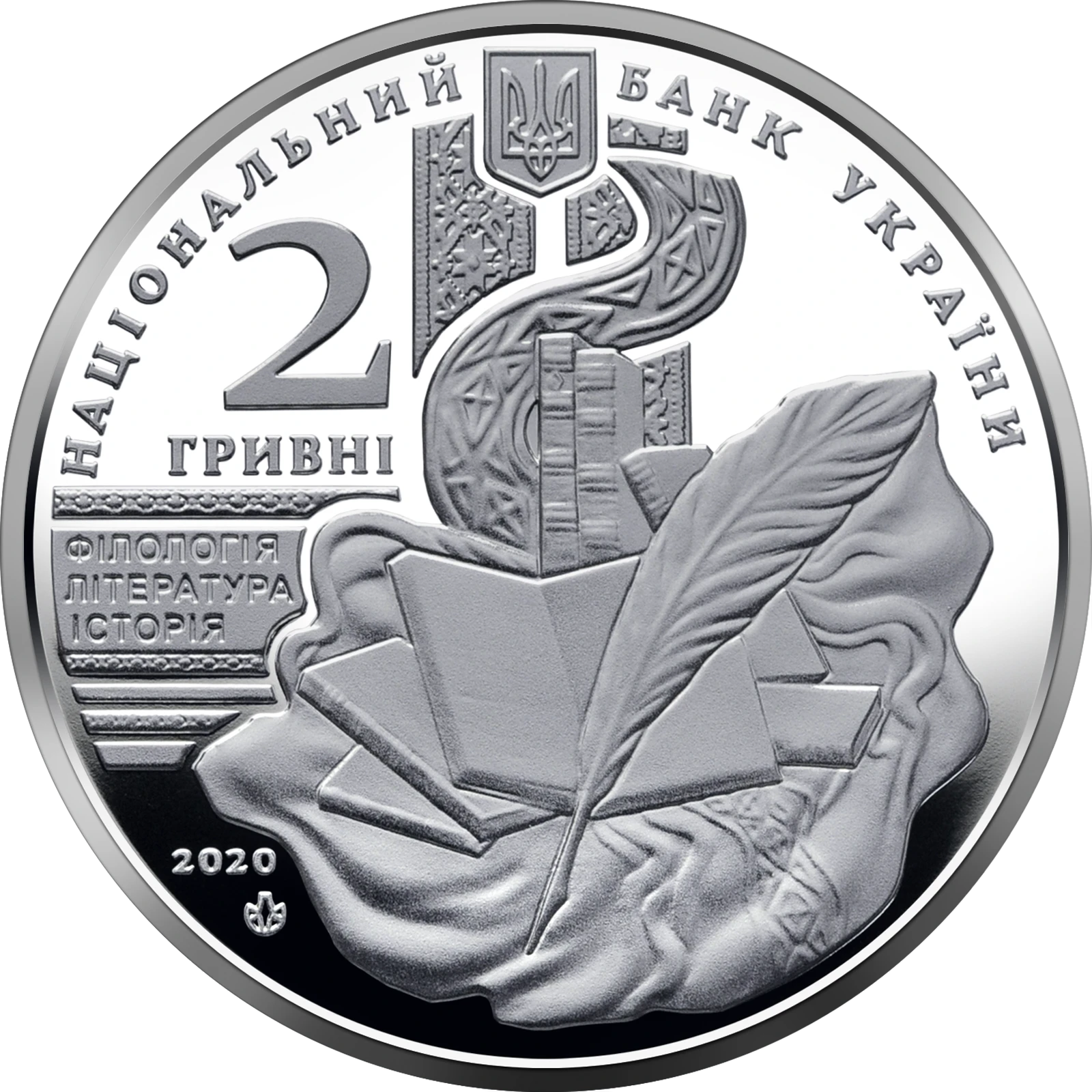 На аверсі монети розміщено: угорі – малий Державний Герб України та напис півколом НАЦІОНАЛЬНИЙ БАНК УКРАЇНИ, ліворуч номінал – 2/ ГРИВНІ, під яким написи: ФІЛОЛОГІЯ/ ЛІТЕРАТУРА/ ІСТОРІЯ (основні сфери діяльності вченого); по центру – стилізована композиція, що символізує професійну діяльність академіка В. Перетца: книги та перо (на тлі розгорнутої книги); рік карбування монети 2020 і логотип Банкнотно-монетного двору Національного банку України (унизу ліворуч).