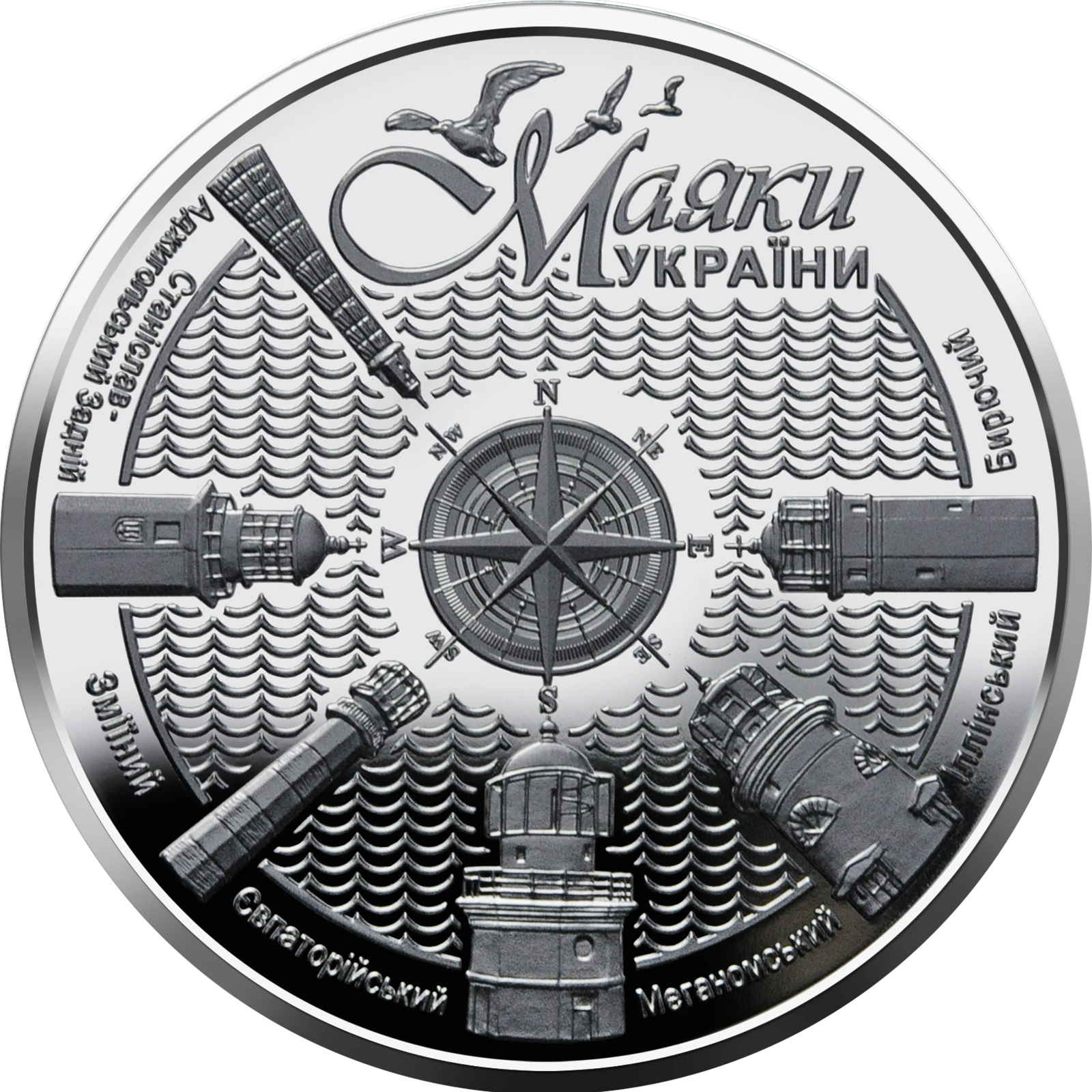 На реверсі монети розміщено: у центрі на тлі лімба компаса – зображення рози вітрів, що символізує правильний вибір шляху та щасливе його завершення, навколо якої на тлі стилізованих хвиль зображено маяки та їхні назви: СТАНІСЛАВ-/АДЖИГОЛЬСЬКИЙ ЗАДНІЙ (угорі ліворуч), ЗМІЇНИЙ (ліворуч), ЄВПАТОРІЙСЬКИЙ (унизу ліворуч), МЕГАНОМСЬКИЙ (унизу), ІЛЛІНСЬКИЙ (унизу праворуч), БИРЮЧИЙ (праворуч); угорі – чайки та напис МАЯКИ/УКРАЇНИ.