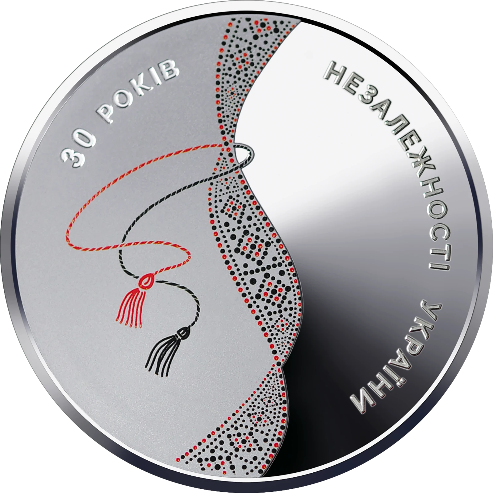 На реверсі монети зображено кольорову вишивану стрічку (використано тамподрук), що символізує код нації і нагадує ДНК, яка є матеріальним носієм генетичної інформації, тобто забезпечує збереження, передавання і відтворення інформації, та півколом розміщено написи: 30 РОКІВ (угорі ліворуч на матовому тлі) НЕЗАЛЕЖНОСТІ УКРАЇНИ (праворуч на дзеркальному тлі).
