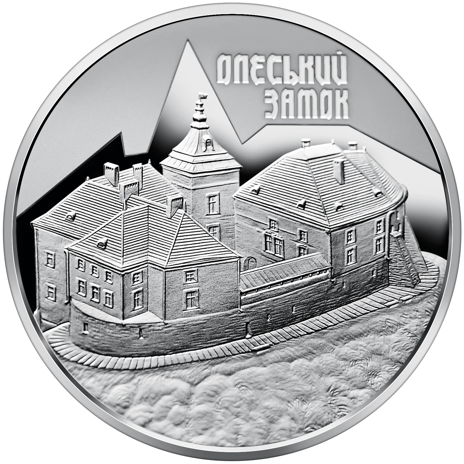 На аверсі монети на тлі зображення Олеського замку з гравюри ХІХ ст. розміщено: ліворуч – малий Державний Герб України; праворуч – різьблене в камені зображення над в’їзною брамою замку часів перебудови Даниловича; унизу на дзеркальному тлі абрису зубців, що символізують оборонне значення замку в певний період його існування, написи: УКРАЇНА/ 2021/ 10 ГРИВЕНЬ.