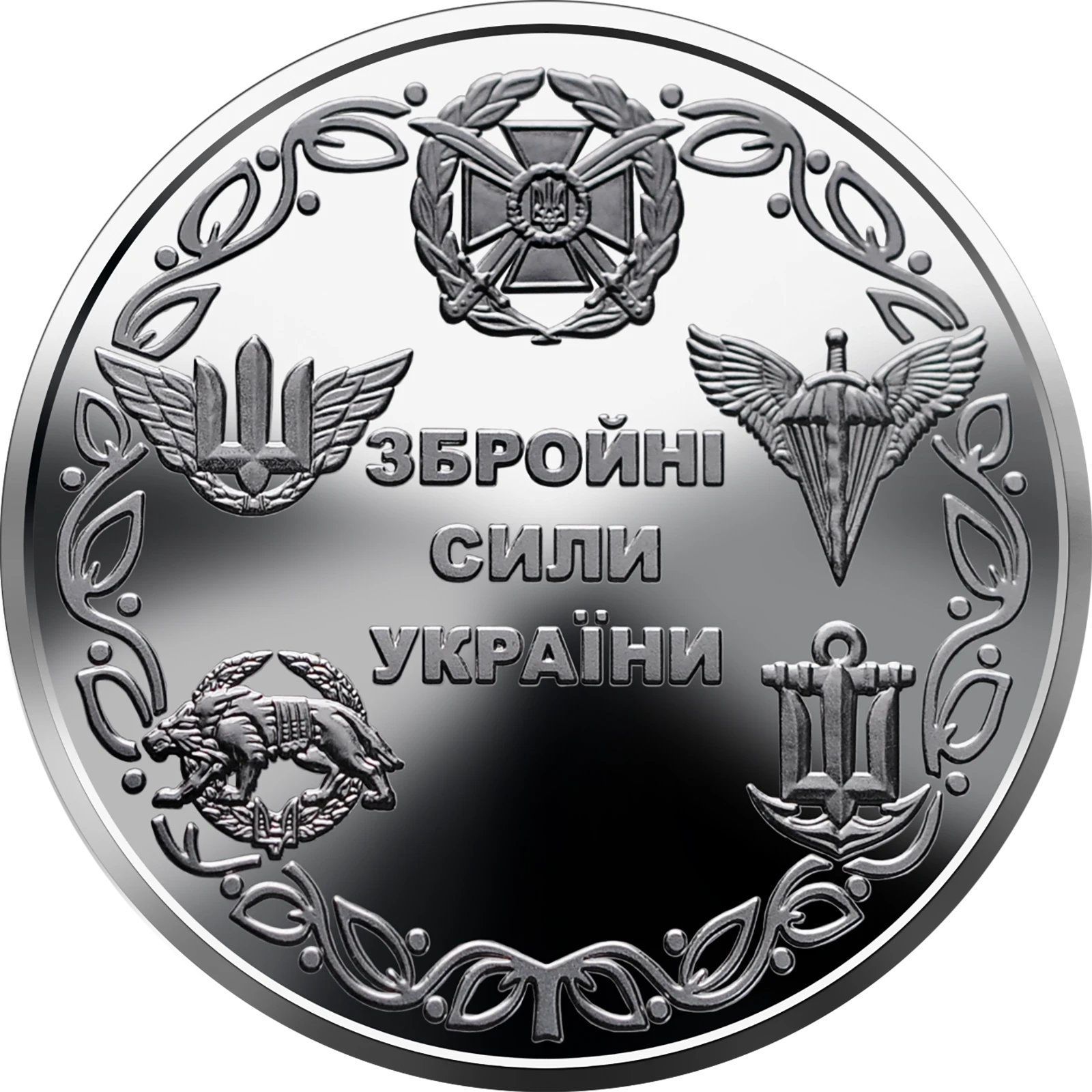 На реверсі монети на тлі стилізованого рослинного орнаменту – військові знаки розрізнення: загальновійськовий беретний знак (угорі), беретний знак Десантно-штурмових військ ЗСУ (праворуч), беретний знак Військово-морських сил ЗСУ (унизу праворуч), беретний знак Сил спеціальних операцій ЗСУ (унизу ліворуч), беретний знак Повітряних сил ЗСУ (ліворуч); у центрі на дзеркальному тлі написи: ЗБРОЙНІ/ СИЛИ/ УКРАЇНИ.