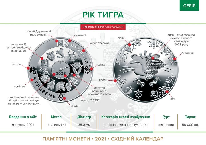 На аверсі монети розміщено: угорі – малий Державний Герб України, праворуч від якого напис півколом УКРАЇНА; на дзеркальному тлі по колу зображені 12 символів східного календаря, у центрі кола – стилізований годинник зі стрілкою, що вказує на тигра – символ року, під стрілкою – 2022; унизу ліворуч напис півколом 5 ГРИВЕНЬ; на матовому тлі зображені стилізовані під українську витинанку символи кожної пори року: сніжинка (угорі), квітка (праворуч), ягода (унизу), листок (ліворуч); логотип Банкнотно-монетного двору Національного банку України (ліворуч від символу кролика).