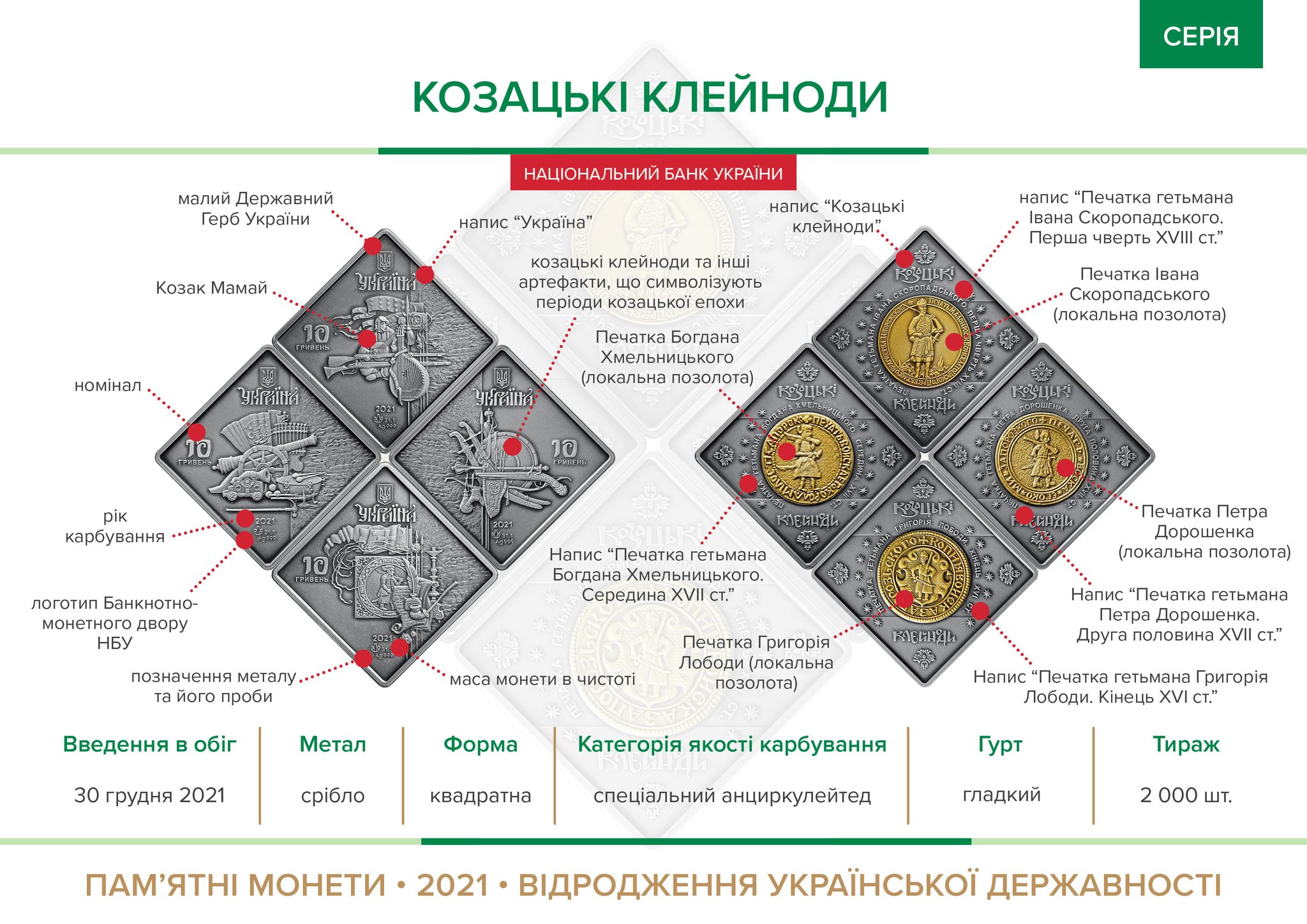 Всі оголошення про продаж монети на нашому сайтіНабір пам`ятних монет присвячений пам’яті про героїчну добу нашої історії, яка для українського народу є невичерпним джерелом національної гідності, волелюбності та державних устремлінь, атрибутам влади – козацьким клейнодам. Історична традиція впродовж віків визначила перелік клейнодів Війська Запорозького – прапор, булава, бунчук, печатка, пернач, литаври, сурми, каламар тощо. Саме гетьманські печатки – невід’ємні атрибути влади гетьманів Григорія Лободи, Богдана Хмельницького, Петра Дорошенка та Івана Скоропадського несуть смисловий акцент набору монет і представляють козацьку добу від її зародження до присмерку й уособлюють потужні історичні пласти. Випуск набору “Козацькі клейноди” звертає нашу увагу на героїчну козацьку епоху, в якій український народ досі черпає духовний досвід і звитягу в обороні рідної землі від зовнішніх ворогів.