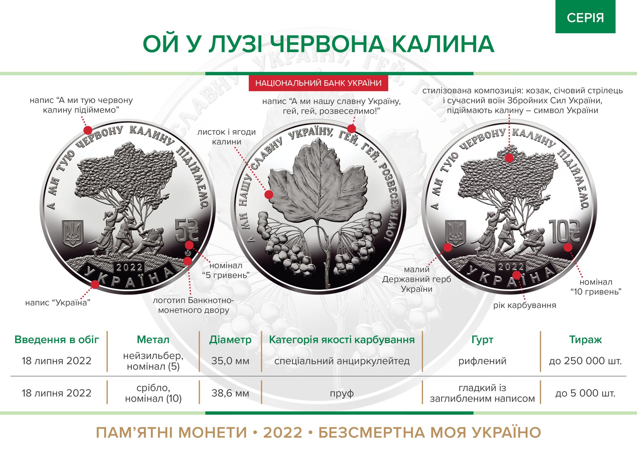 Всі оголошення про продаж монети на нашому сайтіПрисвячена українській народній пісні авторського походження, яка під час безжальної війни росії проти України зазвучала з новою силою, стала українським символом незламності, гімном мужнього протистояння. Українська пісня – це геніальна поетична біографія, духовна і моральна скарбниця нашого народу. З пісень промовляє добра, щедра і прекрасна душа українського народу, у ній відображаються такі ідеали, як любов до Батьківщини, неприйняття будь-якого гноблення, мужність і відвага в боротьбі з ворогом. Саме такою є пісня “Ой у лузі червона калина”, історія якої – це історія нашого народу. Народна пісня, відома з часів козаччини ХVІІ століття, розвивалася, доповнювалася та отримала нове звучання в часи української революції на початку ХХ століття, а нині звучить на цілий світ різними мовами і єднає з попередніми поколіннями борців за волю України.
