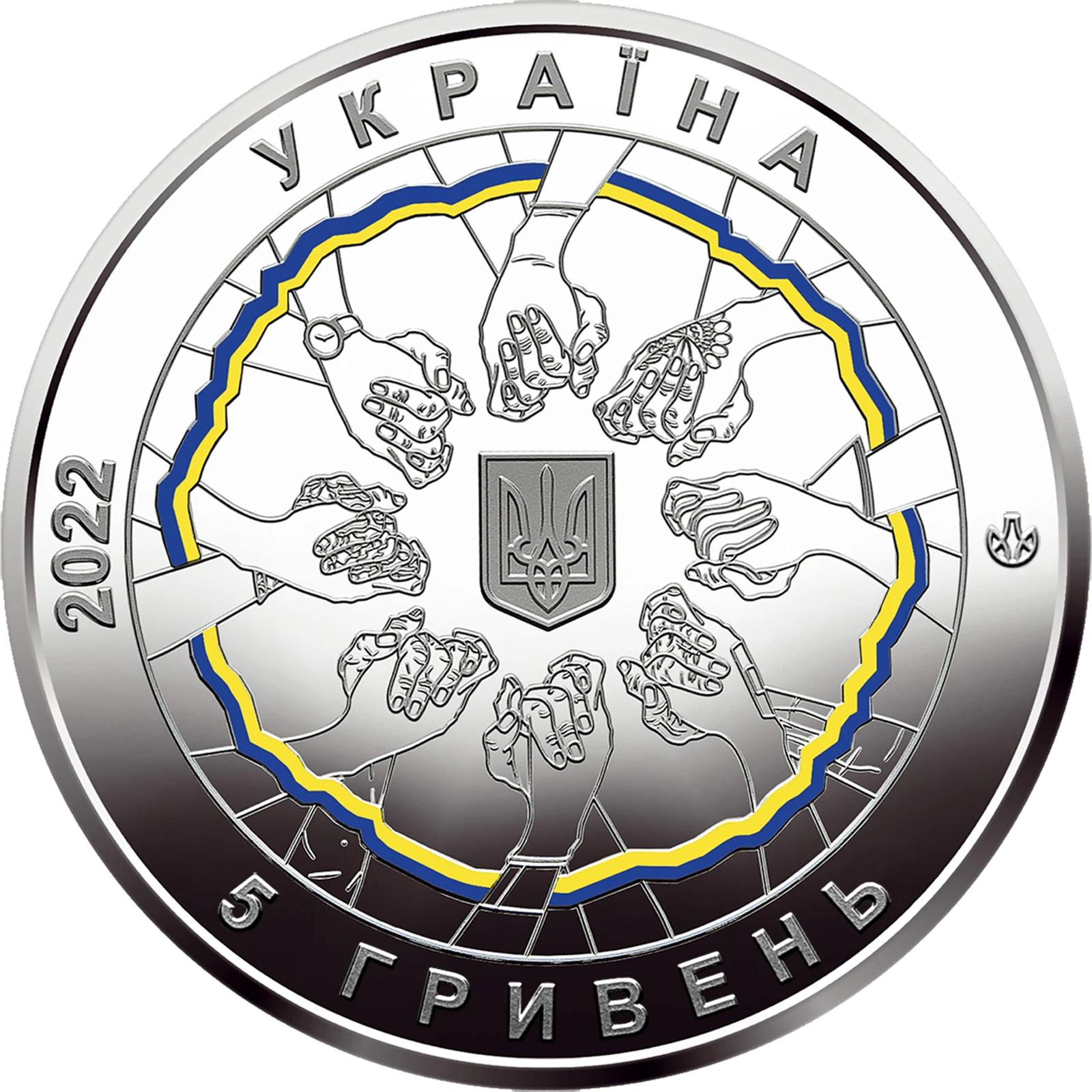 На аверсі монети на дзеркальному тлі розміщено: малий Державний Герб України (у центрі), навколо якого зображено стилізовану символічну композицію єднання людей доброї волі в усьому світі – попарно з’єднані руки, замкнуті в коло та оповиті синьо-жовтою стрічкою (використано тамподрук); написи: УКРАЇНА (угорі півколом), рік карбування монет – 2022 (ліворуч), унизу півколом зазначено номінал – 5 ГРИВЕНЬ; праворуч логотип Банкнотно-монетного двору Національного банку України.