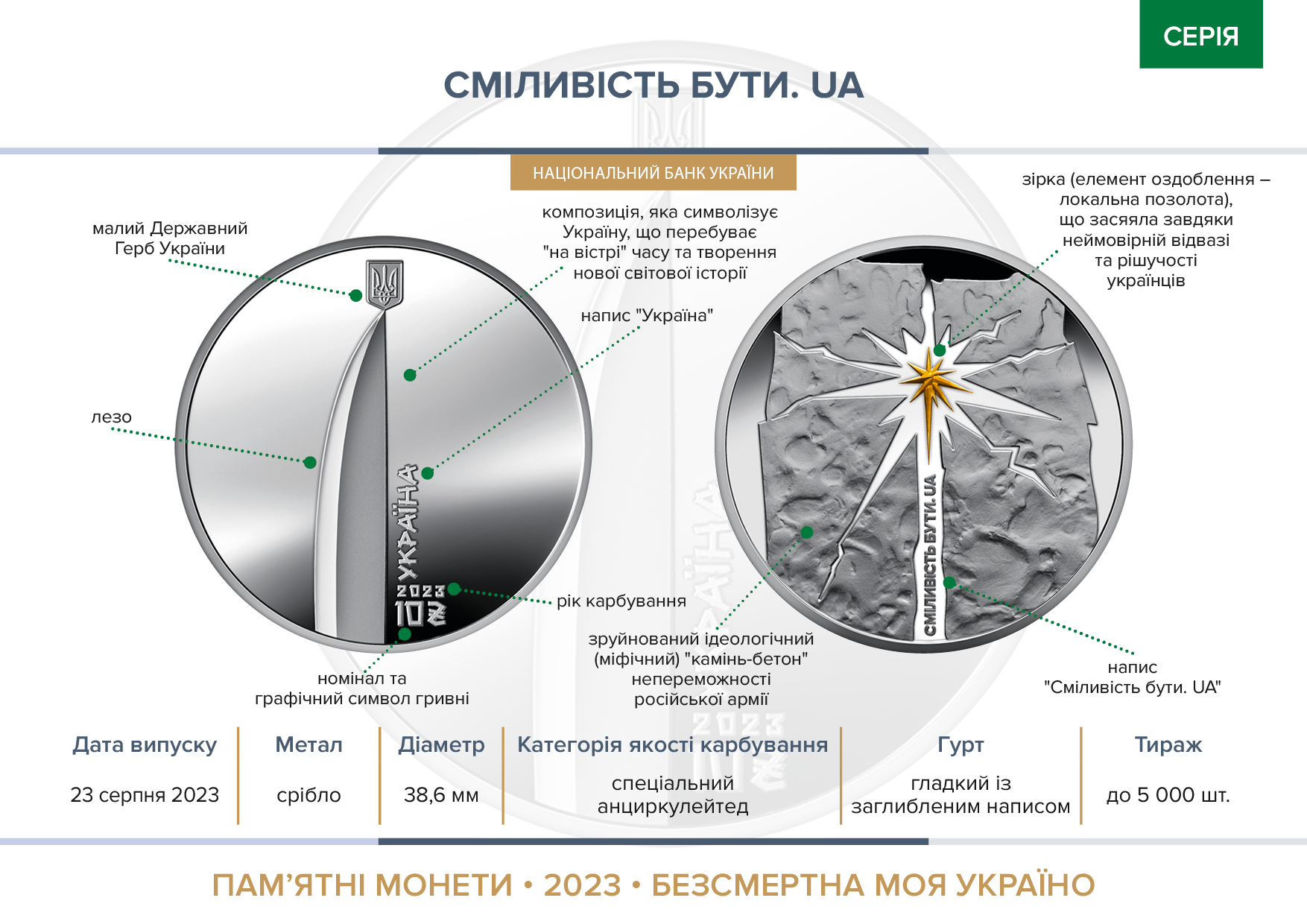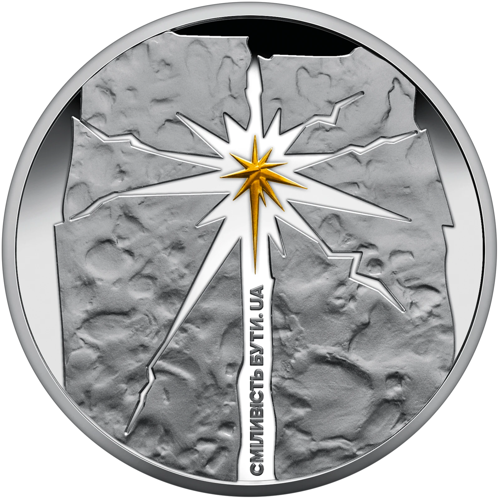 На реверсі монети на дзеркальному тлі розміщено стилізовану композицію, що символізує феномен сміливості та героїчного спротиву українського народу: у центрі композиції зображено зірку, що засяяла новою надією (символічна паралель – Вифлеємська зоря) завдяки неймовірній відвазі та рішучості українців, яка зруйнувала непорушний ідеологічний (міфічний) “камінь-бетон” непереможності російської армії, навіюваний російською пропагандою усьому світу протягом багатьох десятиліть; у центрі вертикальний напис: СМІЛИВІСТЬ БУТИ. UA.