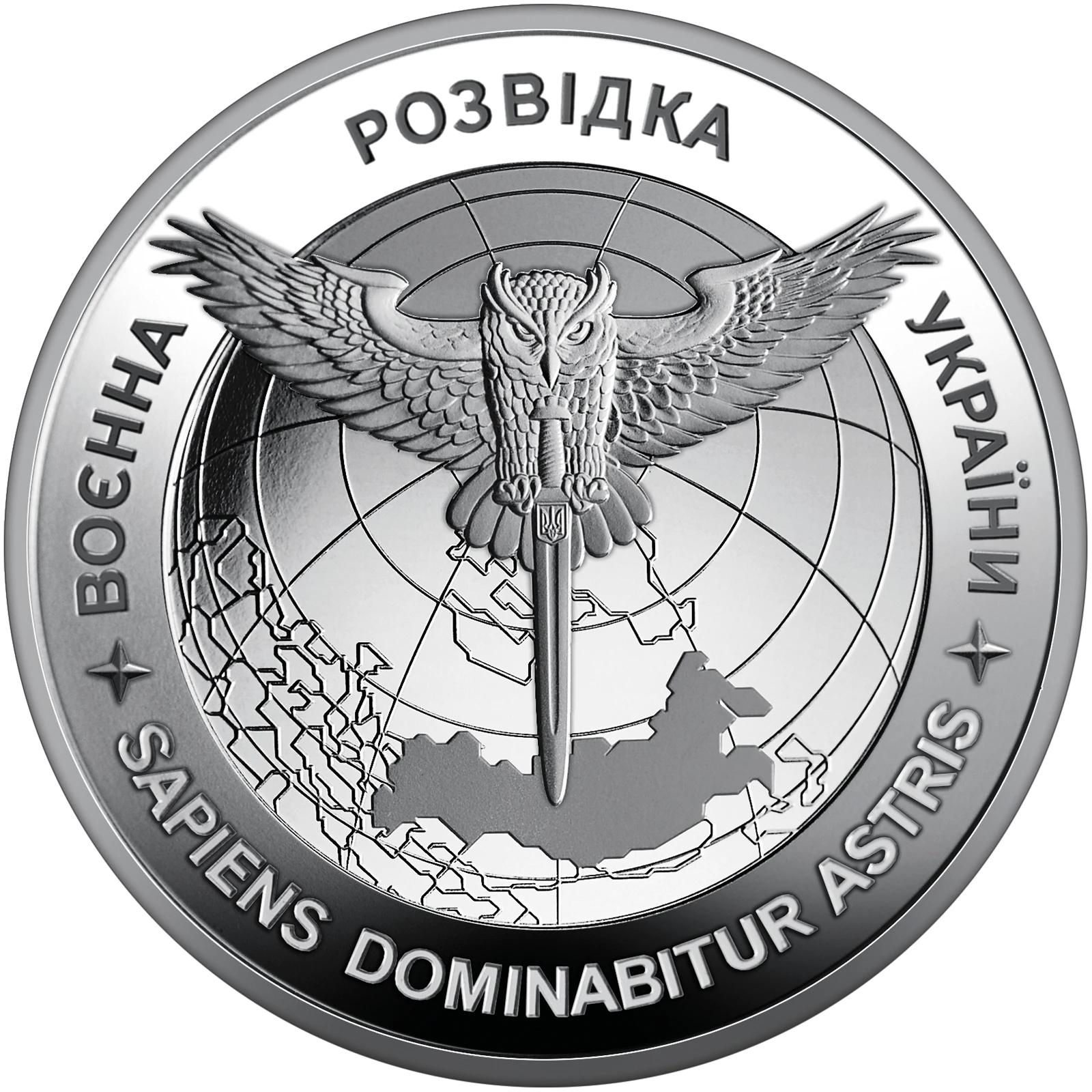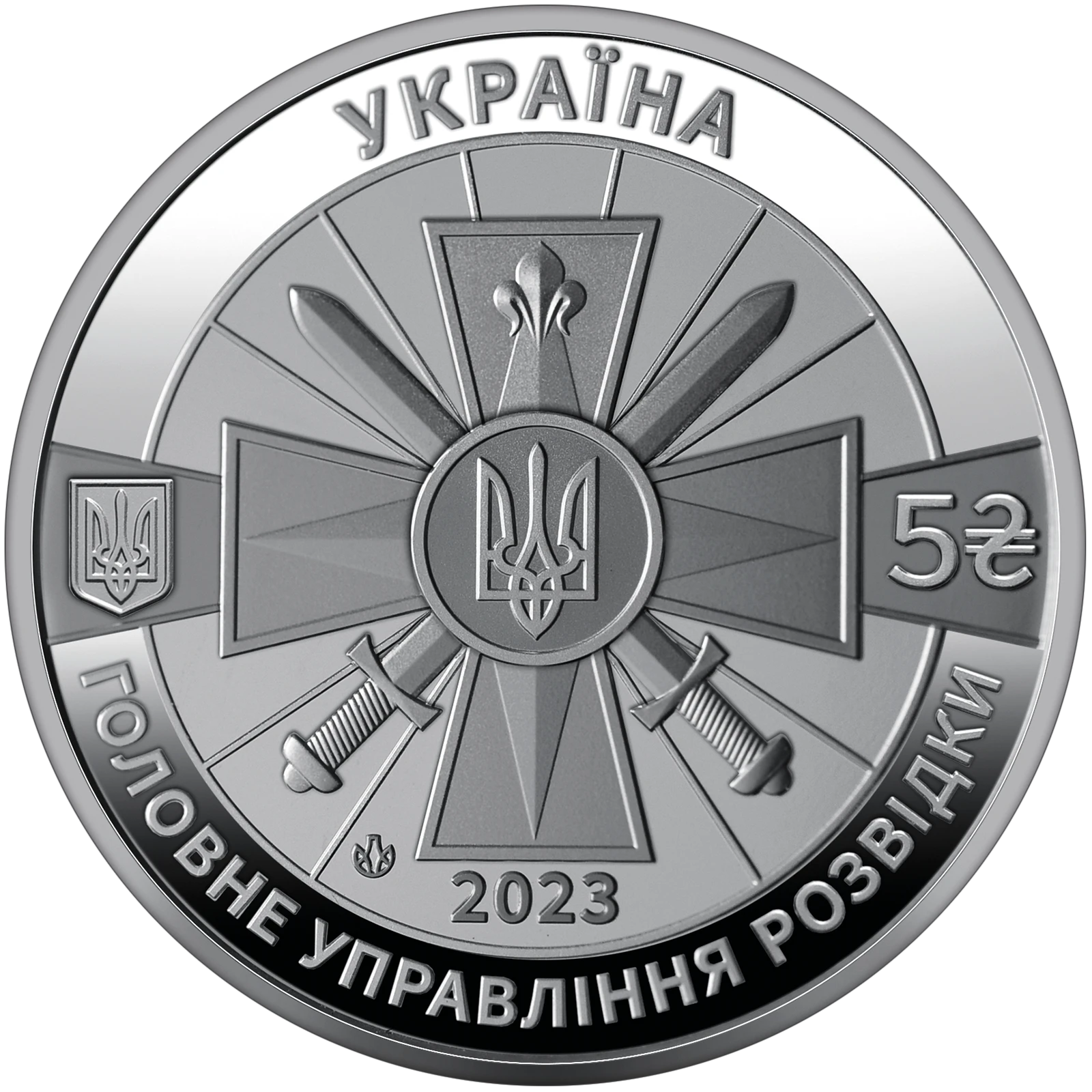 На аверсі монети розміщено: у центрі на матовому тлі – емблема Головного управління розвідки Міністерства оборони України, ліворуч від неї – малий Державний Герб України; праворуч – номінал 5 та графічний символ гривні; написи: УКРАЇНА (півколом угорі), 2023/ГОЛОВНЕ УПРАВЛІННЯ РОЗВІДКИ (унизу); логотип Банкнотно-монетного двору Національного банку України (ліворуч від емблеми).