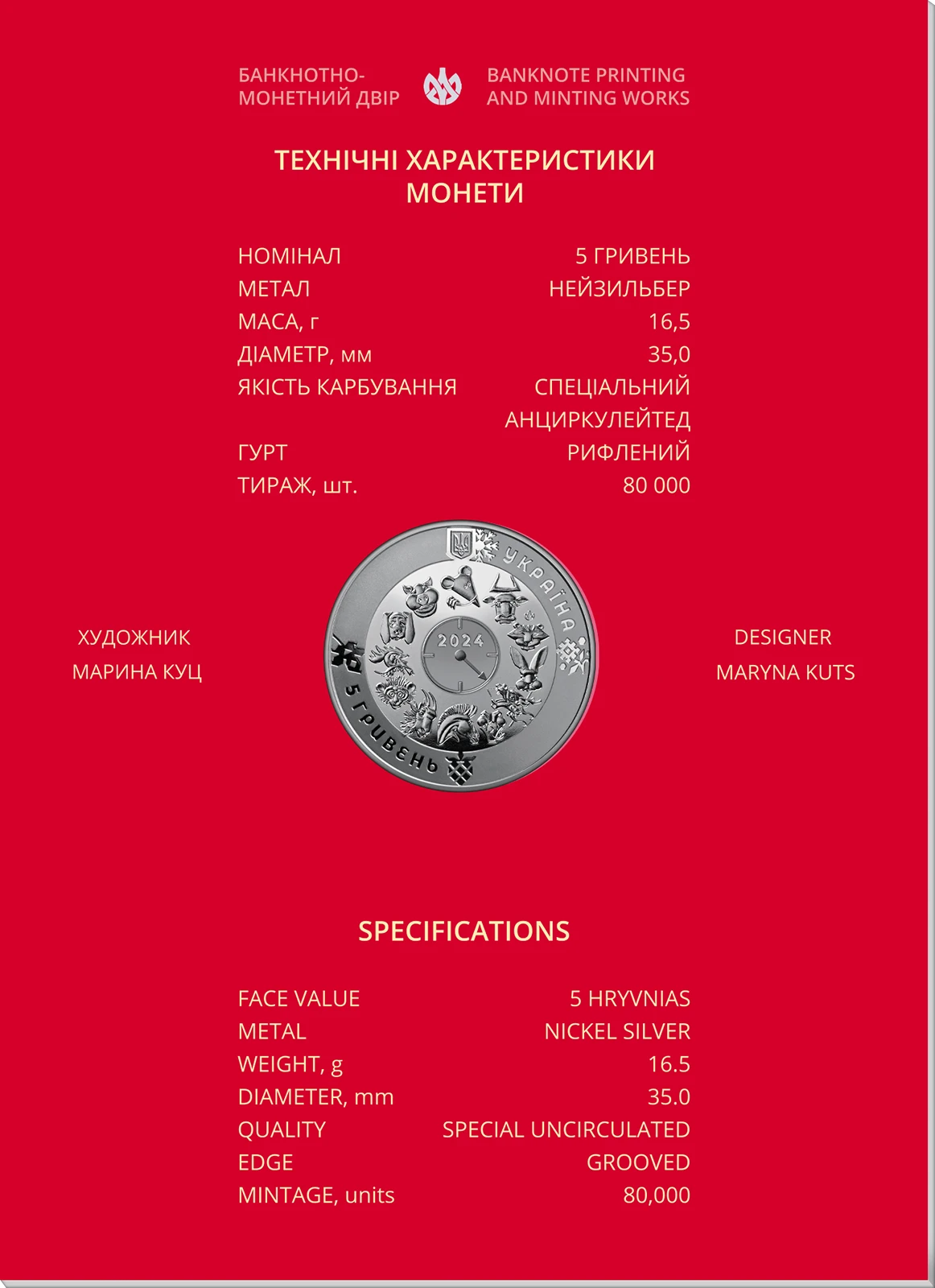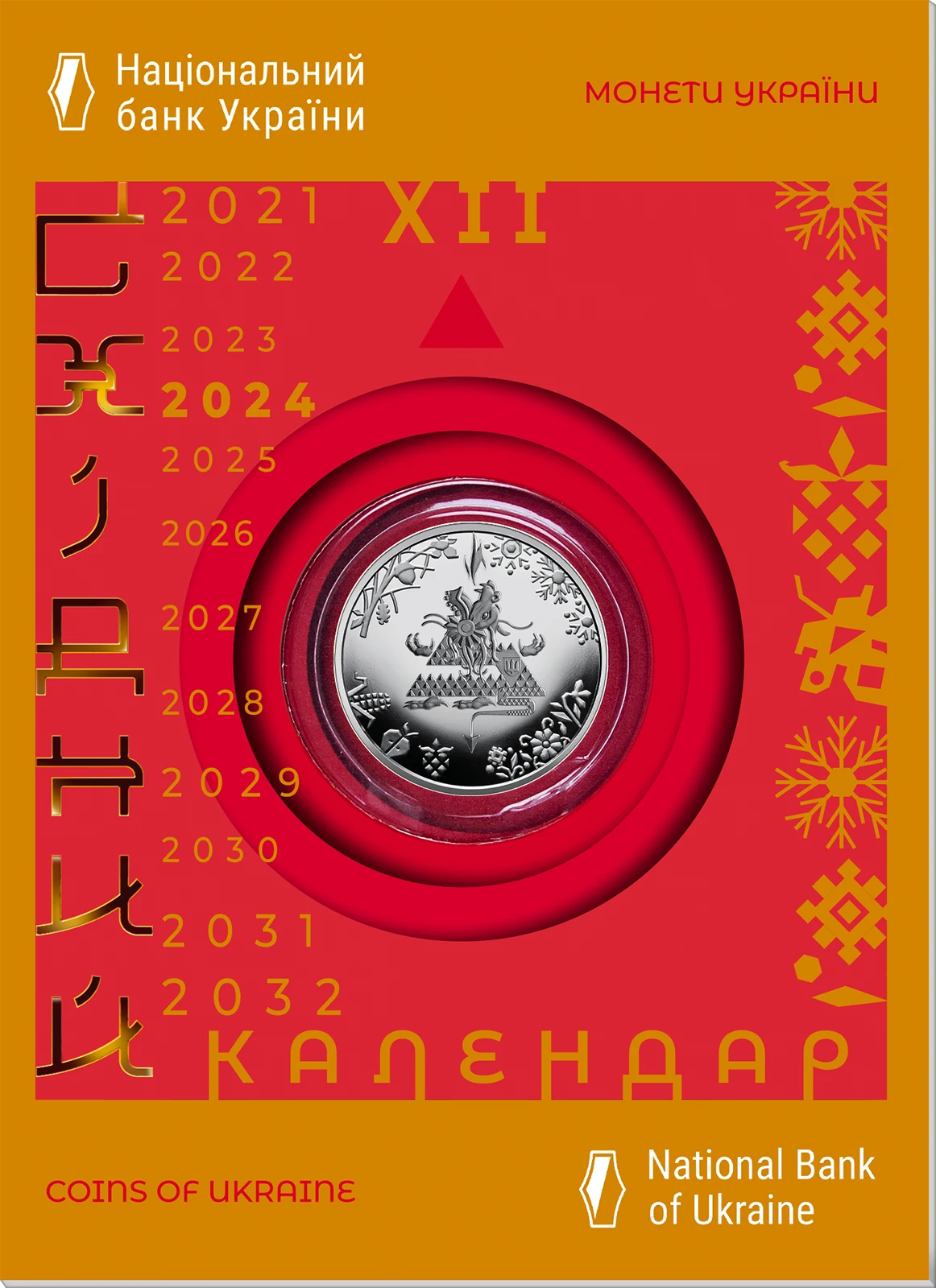 Всі оголошення про продаж монети на нашому сайтіНа аверсі монети розміщено: угорі – малий Державний Герб України, праворуч від якого напис півколом УКРАЇНА; на дзеркальному тлі по колу зображені 12 символів східного календаря, у центрі кола – стилізований годинник зі стрілкою, що вказує на дракона – символ року, під стрілкою – 2024; унизу ліворуч напис півколом 5 ГРИВЕНЬ; на матовому тлі зображені стилізовані під українську витинанку символи кожної пори року: сніжинка (угорі), квітка (праворуч), ягода (унизу), листок (ліворуч); логотип Банкнотно-монетного двору Національного банку України (праворуч над символом тигра).