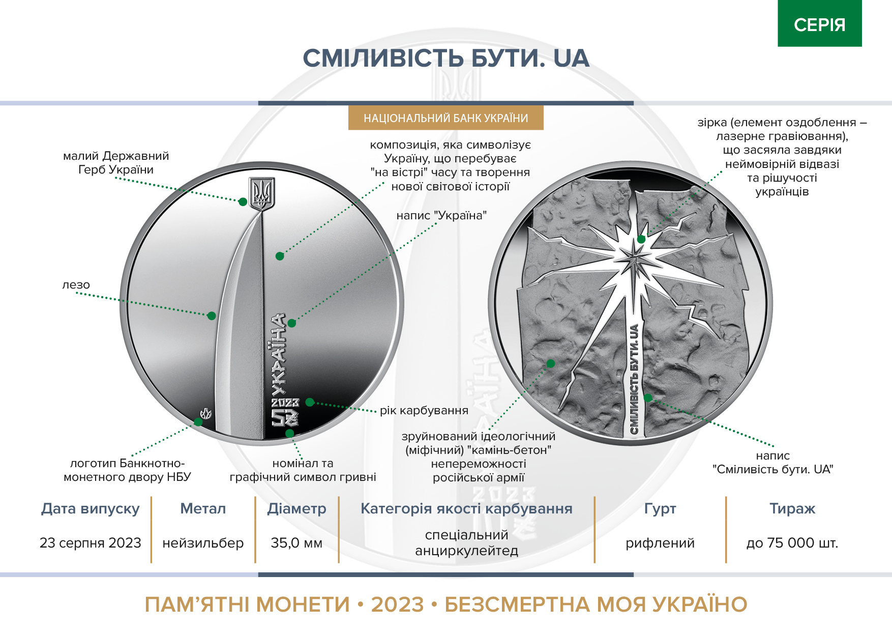На реверсі монети на дзеркальному тлі розміщено стилізовану композицію, що символізує феномен сміливості та героїчного спротиву українського народу: у центрі композиції зображено зірку, що засяяла новою надією (символічна паралель – Вифлеємська зоря) завдяки неймовірній відвазі та рішучості українців, яка зруйнувала непорушний ідеологічний (міфічний) “камінь-бетон” непереможності російської армії, навіюваний російською пропагандою усьому світу протягом багатьох десятиліть; у центрі вертикальний напис: СМІЛИВІСТЬ БУТИ. UA.