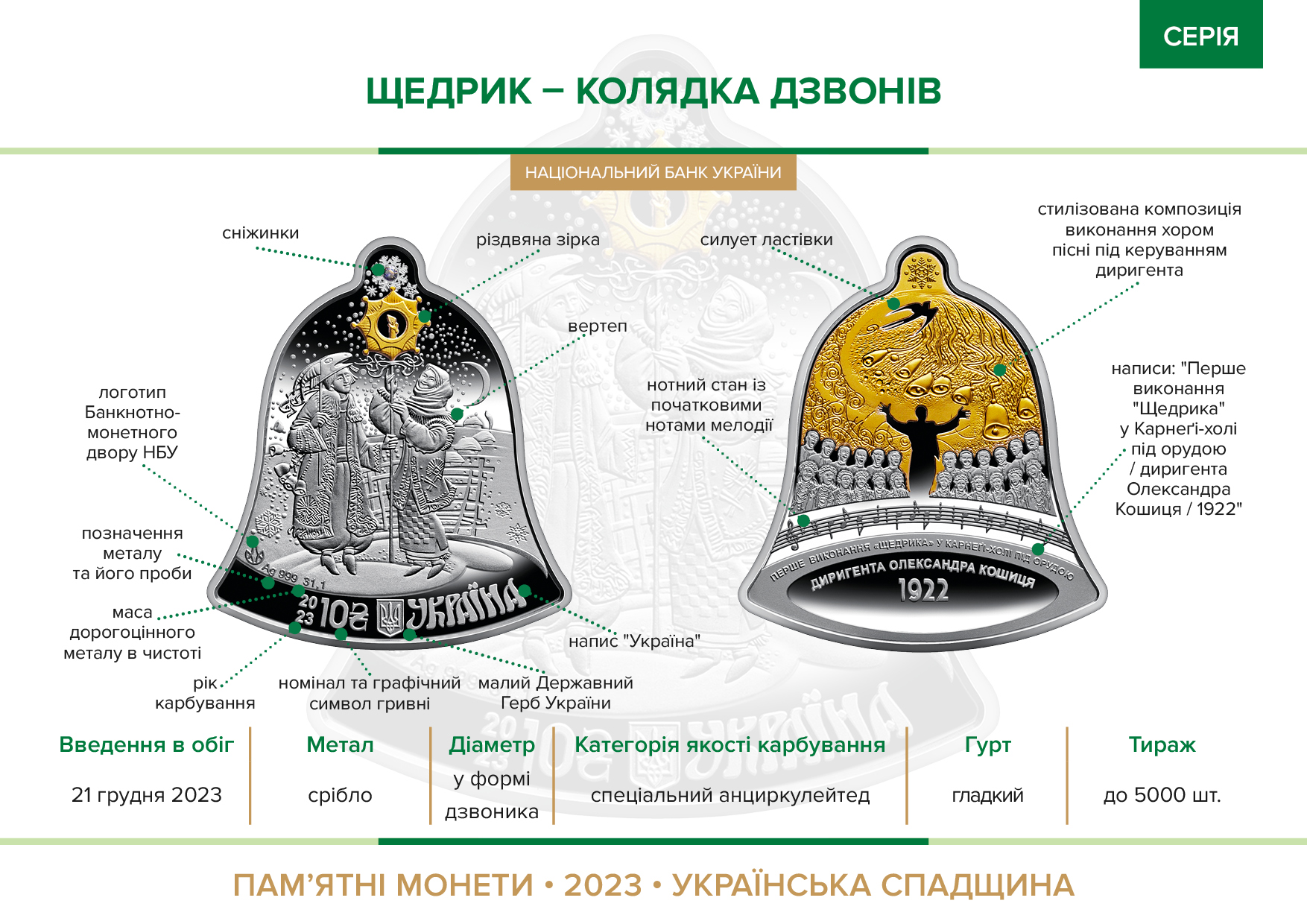 Набір із трьох срібних пам’ятних монет присвячений одному з національних музичних символів – всесвітньовідомій колядці “Щедрик” в обробці Миколи Леонтовича. Українська республіканська капела під проводом видатного диригента Олександра Кошиця як культурний представник України з 1919 до 1924 року дала понад 600 концертів у світових музичних центрах. Перлиною репертуару хору був “Щедрик”, який 05 жовтня 1922 року прозвучав у найпрестижнішому залі Нью-Йорка – Карнеґі-холі. Згодом американський диригент українського походження Пітер Вільговський написав новий текст “Щедрика” та поклав мелодію на “мову” симфонічного оркестру. Так з’явилася “Колядка дзвонів” (Carol of the Bells), що стала однією з найпопулярніших різдвяних пісень у світі, мелодика якої нагадує передзвін.