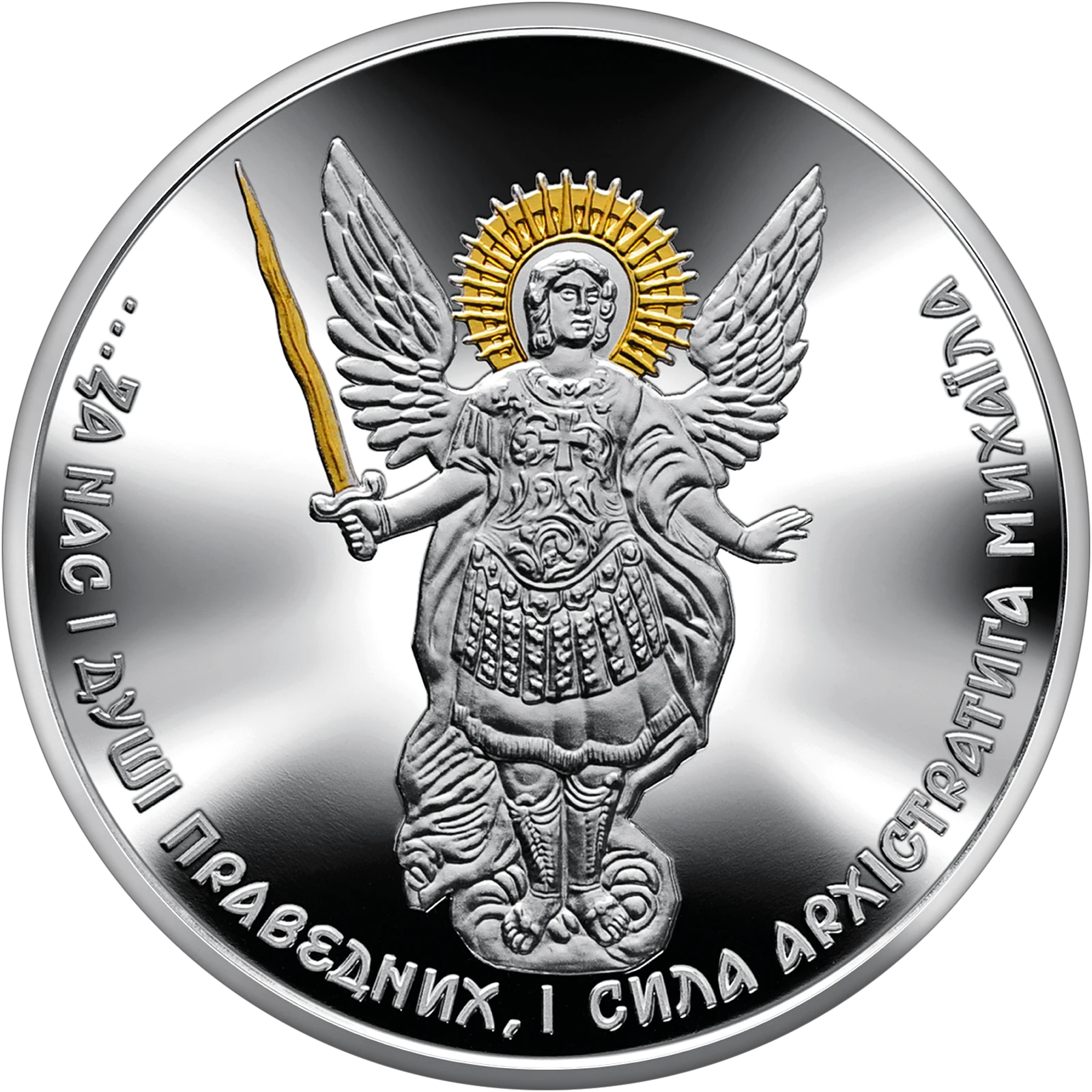 Всі оголошення про продаж монети на нашому сайтіПрисвячена архангелу, який є одним із найшанованіших біблійних персонажів та іменується як архістратиг-головнокомадуючий. Архангел Михаїл – незмінний борець із силами зла, захисник віри, покровитель воїнів, які борються за праведне діло та захищають добро. Архістратиг Михаїл – “небесний оборонець” українського війська. Шанобливе ставлення до архістратига Михаїла зберігається з великокнязівських часів до наших днів – він став символом небесного захисту влади київських князів, пізніше це шанування було зафіксовано не тільки топонімічно – у назвах церковних споруд, а й геральдично – на гербах Києва, Київського воєводства, Київської губернії. Сьогодні його образ присутній в атрибутиці українських десантників і знову уособлює боротьбу із силами зла.