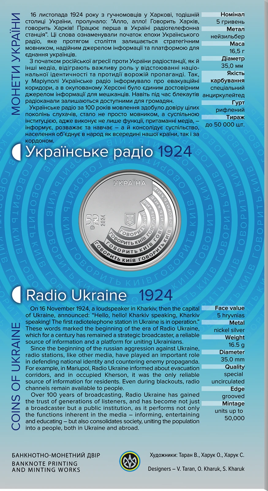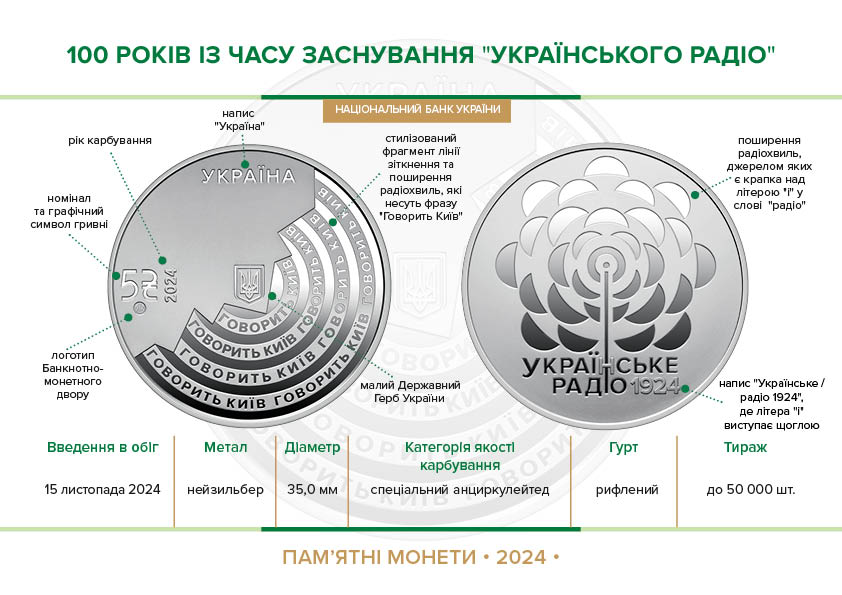 Пам’ятна монета присвячена сторіччю першого українського радіомовника, який безперервно працює з 1924 року. “Українське Радіо” є найстарішим радіо країни, важливим стратегічним мовником та платформою для єднання українців. За ці роки воно здобуло довіру поколінь слухачів і стало суспільною інституцією, яка інформує, розважає, навчає та консолідує громадян як всередині країни, так і за її межами.