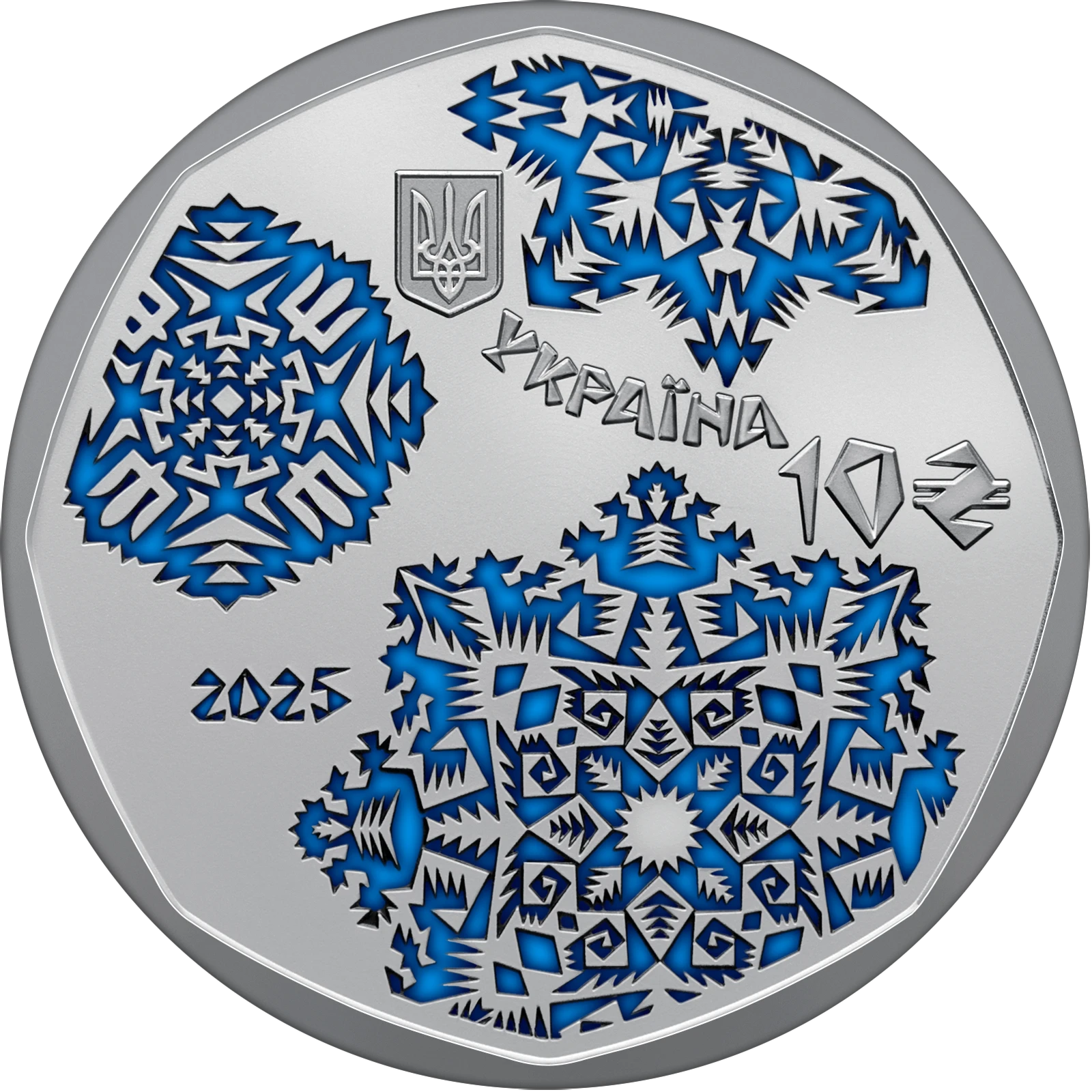 Всі оголошення про продаж монети на нашому сайтіНа аверсі монети розміщено витончений декоративний витинанковий мотив у вигляді сніжинок, які традиційно використовуються для прикрашання зимових вікон. У верхній частині монети, між сніжинками, зображено малий Державний Герб України, номінал 10 та графічний символ гривні ?, а також написи УКРАЇНА / 2025.