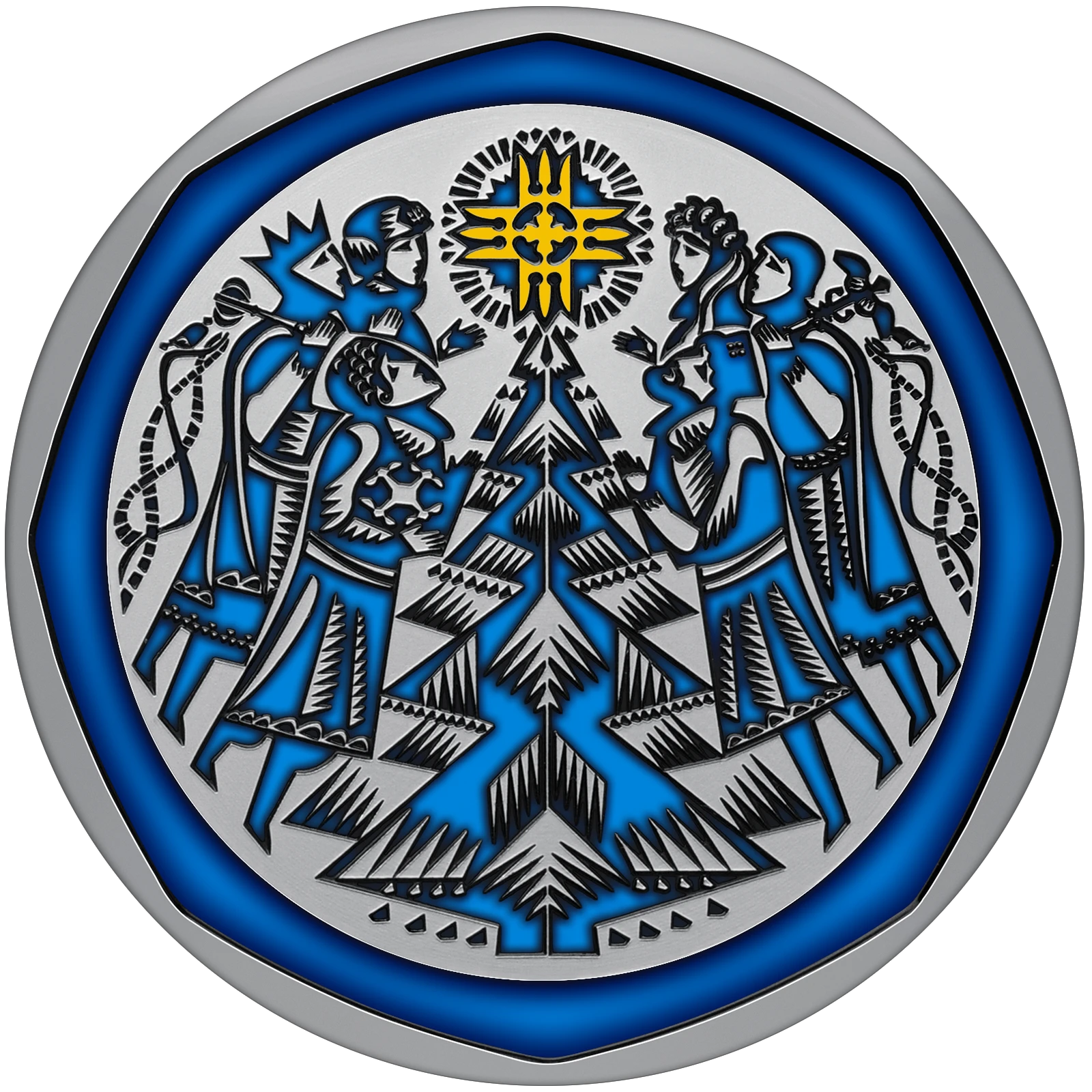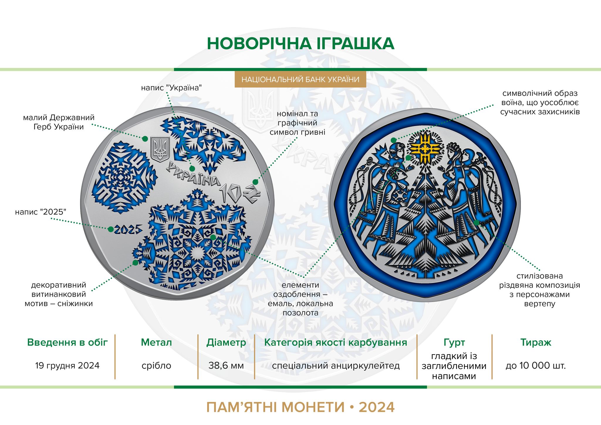 Пам’ятна монета присвячена святкуванню Різдва та Нового року. Ця монета символізує радість і тепло зимових свят, які об’єднують родини й дарують незабутні моменти. Мереживні витинанки прикрашають вікна, а театралізований вертеп розповідає про народження Ісуса Христа.
