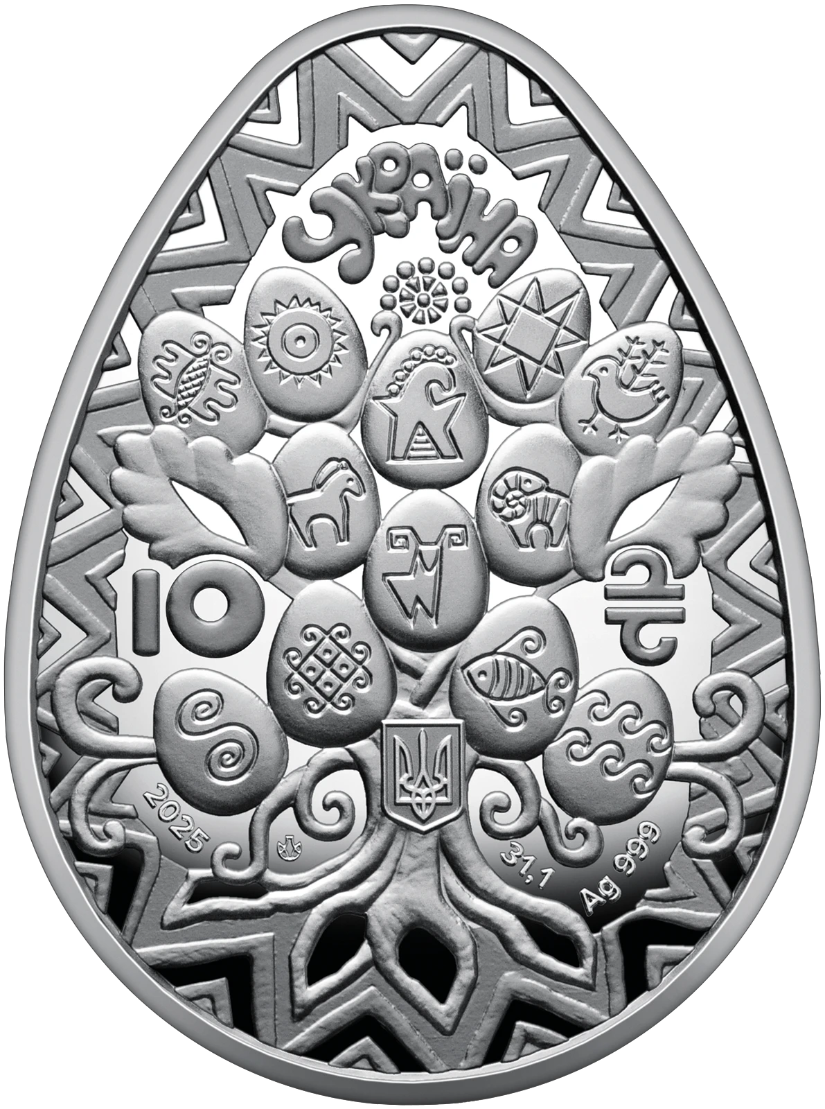Всі оголошення про продаж монети на нашому сайтіНа аверсі монети в центрі композиції розміщено стилізоване дерево життя, яке є символом всесвіту, зображеним у формі дуба – образу сили, захисту, довголіття, чоловічої мужності та вірності. Дерево умовно поділено на три яруси (світи), кожен з яких містить 12 писанок, що відображають 12-річний цикл, із символами, притаманними кожному світу.У верхній частині дерева, що відображає небесний світ, зображені берегиня – жінка-богиня, охоронниця всього сущого, над якою розташована стилізована квітка як символ людської душі; сонце – джерело життя і шанований із давніх часів небесний вогонь; зірка (ружа) – символізує сонце, життя, розвиток і благополуччя; бджола – знак родючості та працьовитості; птах – уособлення вічності, безсмертної душі та духів предків. 2 Стовбур дерева є зображенням земного світу, в якому розміщені образи: оленя – тварини, що приносить світло, асоціюючись із землеробством і знаннями; коня – символу сили, руху та чоловічої природи; барана – уособлення творчої енергії. Нижня частина дерева, коріння, представляє підземний світ і воду, тут відтворено такі символи: сигма (S), що зображує підземного змія як охоронця домашнього вогнища; оберіг, який поєднує знаки хреста, ромба, сварги, рогів барана й крапок; риба – символ родючості, життя і християнства; хвилі, які уособлюють безперервний рух води, життя й світу в цілому. Навколо дерева – рамка з трикутників, що символізує триєдність всесвіту: небо, земля і вода, а також відображає концепцію божественної трійці, гармонію і завершеність через рівнобічний трикутник. У верхній частині монети зазначено напис УКРАЇНА, нижче – номінал 10 (ліворуч) та графічний символ гривні (праворуч), малий Державний Герб України, рік карбування монети 2025, логотип Банкнотно-монетного двору Національного банку України, а також позначення металу та його проби – Ag 999, маси в чистоті – 31,1.