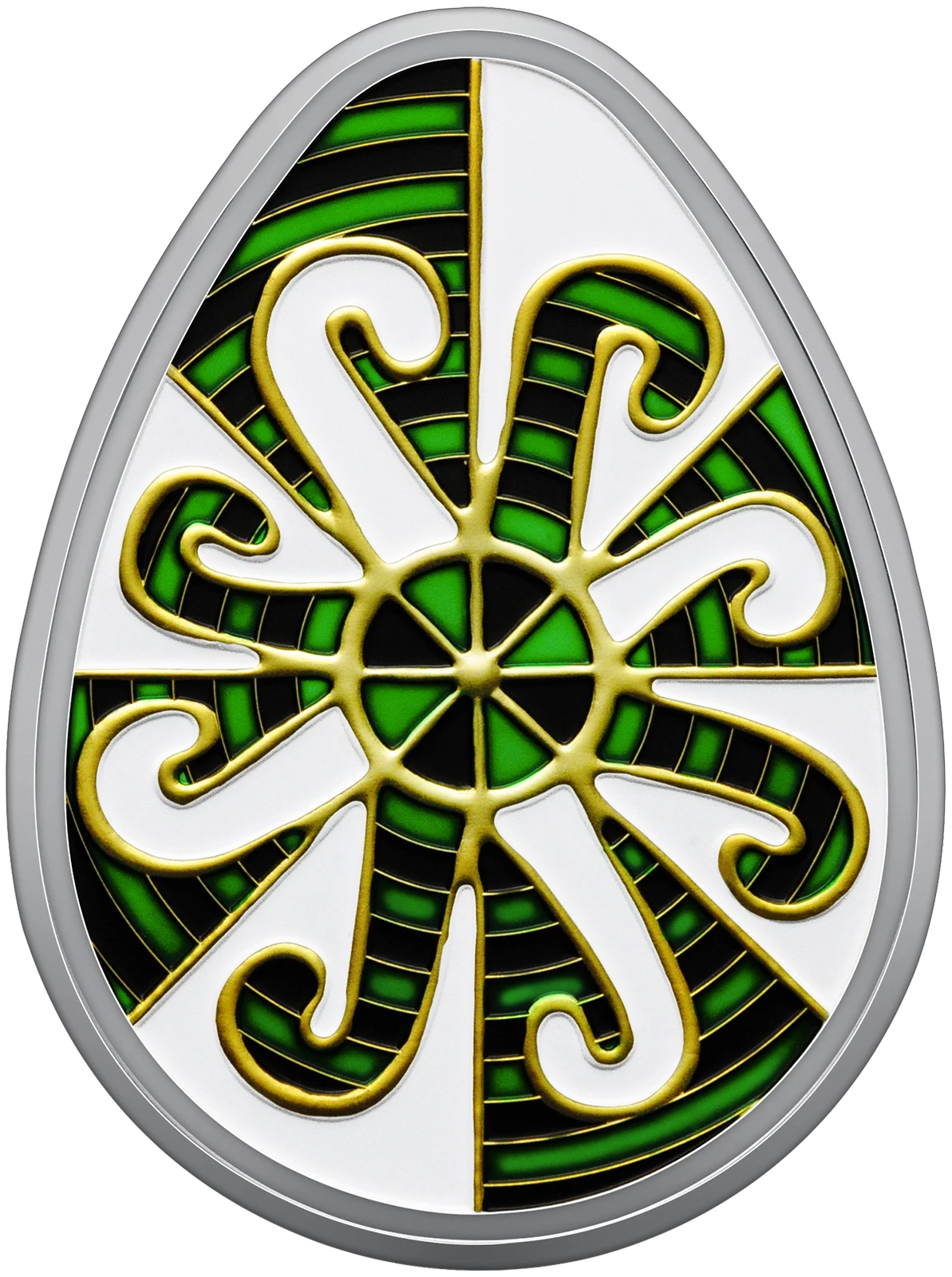 На реверсі монети зображено традиційну писанку Одеської області, відому як “Сорокопуть” або “Козачі левади”. Писанка оздоблена складними орнаментами, кожен з яких має глибокий зміст. Сварга – один із найдавніших символів сонця, щастя, добра, побажання благополуччя та захисту від лиха. Прямий і косий хрести уособлюють тривимірний всесвіт, що об’єднує різні рівні буття. Драбинки символізують духовне зростання, шлях до Бога та прагнення до вищого життя. Сонце на писанці уособлює джерело життя – небесний вогонь, який завжди шанували як символ тепла і світла. Розташовані на білому тлі дві сварги, накладаючись одна на одну під кутом, створюють ефект постійного руху та енергії. Це враження підсилюється серединним колом, яке символізує космос і нескінченність. Поєднання зеленого й чорного кольорів, окреслених жовтим контуром, додає орнаменту особливої напруги та сили, що надихає і заряджає енергією.