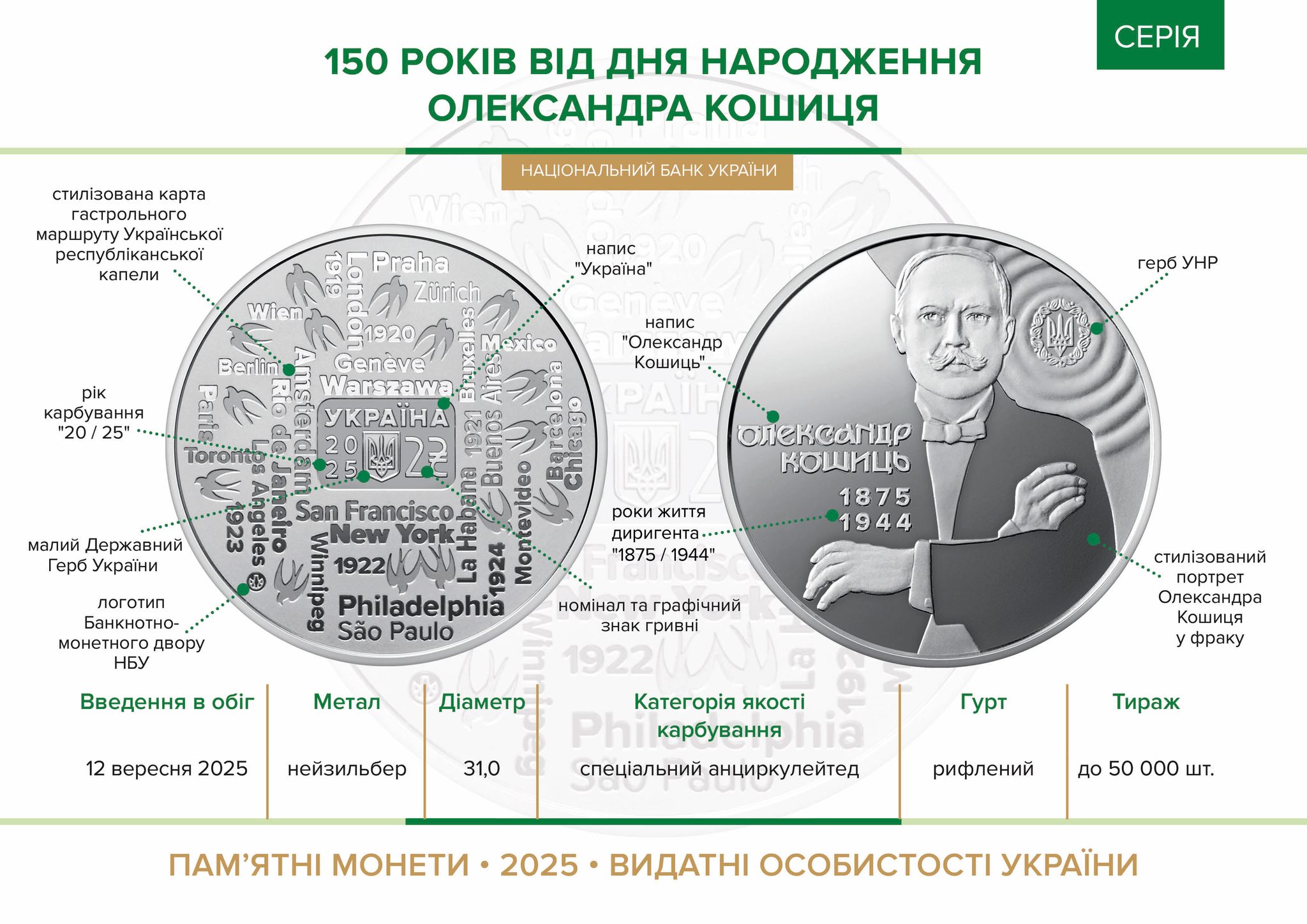 Пам’ятна монета присвячена видатному українському хоровому диригенту, композитору, етнографу та педагогу Олександру Кошицю (1875–1944), який відіграв ключову роль у популяризації української музичної культури на міжнародній арені. Пам’ятна монета вшановує творчу спадщину митця, який на запрошення голови Директорії УНР Симона Петлюри очолив Українську республіканську капелу. Упродовж 1919–1924 років під керівництвом Олександра Кошиця капела здійснила гастрольне турне 17 країнами світу, давши понад 600 концертів. Саме тоді світ уперше почув “Щедрика” Миколи Леонтовича – твір, що згодом став всесвітньо відомим різдвяним хітом “Carol of the Bells”.