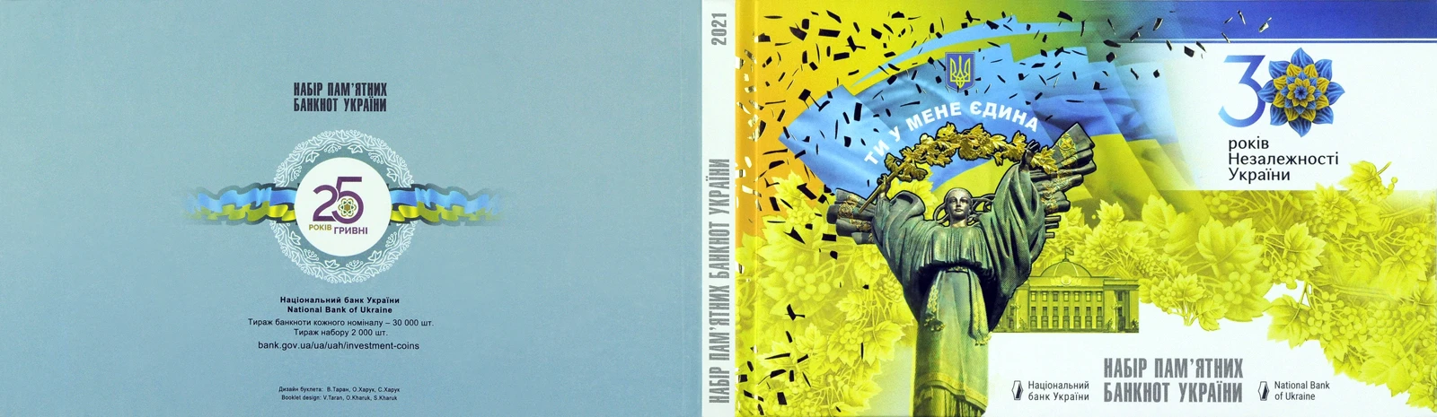Набор памятных банкнот всех номиналов (20, 50, 100, 200, 500, 1 000 грн) к 30-летию независимости Украины в клясере