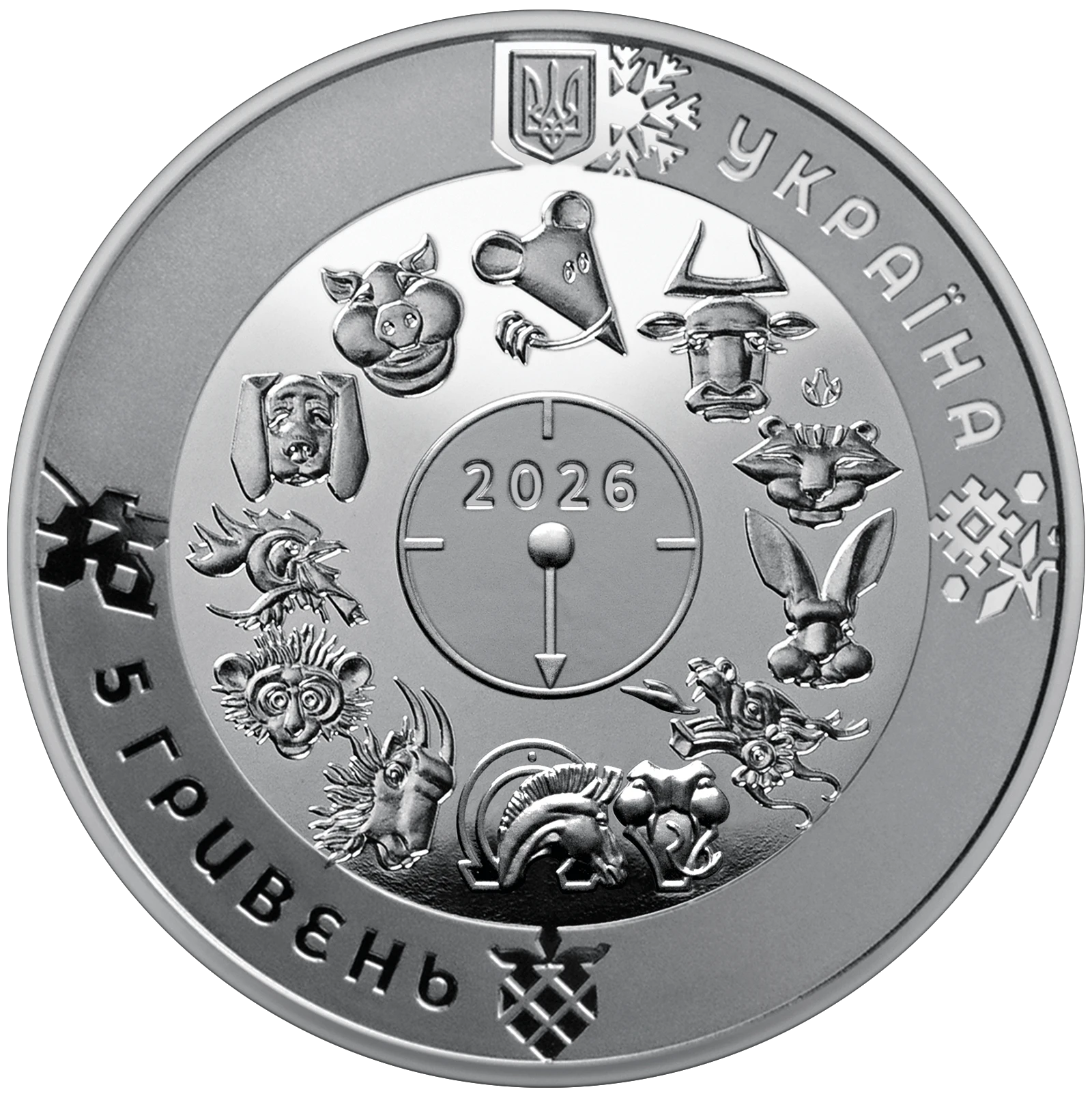 Всі оголошення про продаж монети на нашому сайтіНа аверсі монети розміщено: угорі – малий Державний Герб України, праворуч від якого напис півколом УКРАЇНА; на дзеркальному тлі по колу зображені 12 символів східного календаря, у центрі кола – стилізований годинник зі стрілкою, що вказує на коня – символ року, над стрілкою – 2026; унизу ліворуч напис півколом 5 ГРИВЕНЬ; на матовому тлі зображені стилізовані під українську витинанку символи кожної пори року: сніжинка (угорі), квітка (праворуч), ягода (унизу), листок (ліворуч); логотип Банкнотно-монетного двору Національного банку України (праворуч над символом тигра).