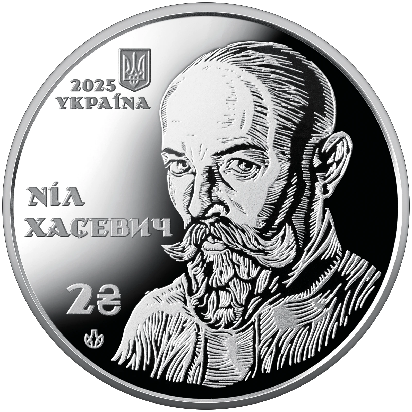 Всі оголошення про продаж монети на нашому сайтіНа аверсі монети в центрі композиції розміщено автопортрет Ніла Хасевича, виконаний у характерній для митця техніці деревориту, що вирізняється експресивною графікою, контрастною лінійністю та динамічним штрихуванням. Ліворуч на дзеркальному тлі зображено: малий Державний Герб України, рік карбування 2025, напис УКРАЇНА (вгорі); напис НІЛ / ХАСЕВИЧ (по центру); номінал 2 з графічним знаком гривні та логотип Банкнотно-монетного двору Національного банку України (унизу).