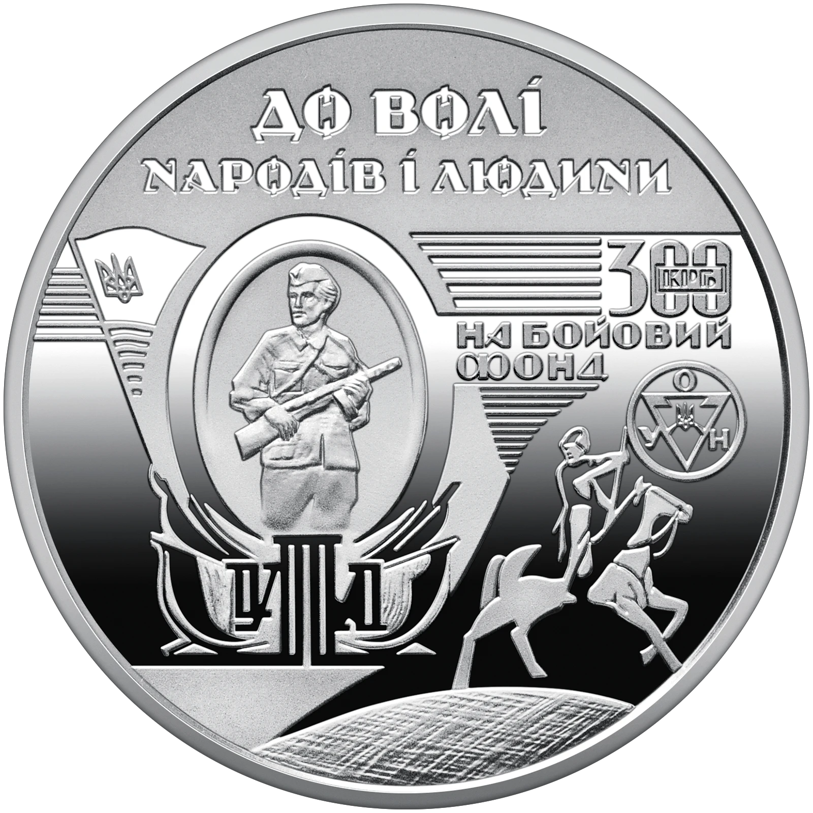 На реверсі монети зображено символічну композицію з фрагментів деревориту Ніла Хасевича, стилізовану під банкноту в дусі бофонів. Композиція містить елементи графіки митця як символу економічного, ідеологічного та морального ресурсу опору. Угорі на матовому тлі розміщено написи: ДО ВОЛІ / НАРОДІВ І ЛЮДИНИ та 300 КРБ / НА БОЙОВИЙ / ФОНД, що підкреслюють роль бофонів у зборі ресурсів для опору та співзвучні із сьогоднішньою практикою донатів.