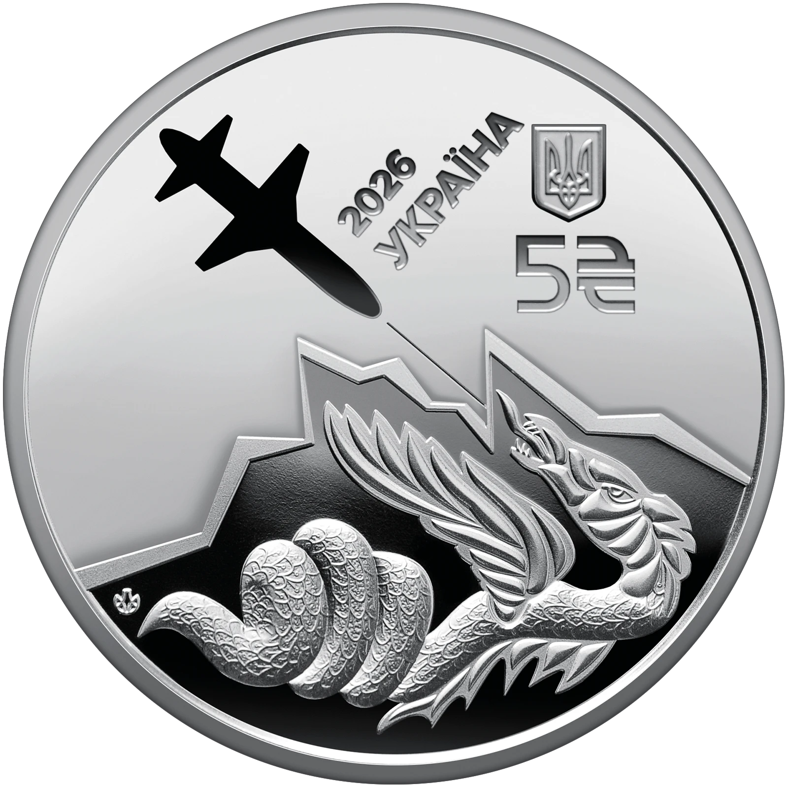 Всі оголошення про продаж монети на нашому сайтіНа аверсі монети зображено стилізований силует ракети-дрона “Паляниця”, що вражає змія. У верхній частині композиції зазначено: напис УКРАЇНА, номінал 5 та графічний знак гривні, рік карбування монети – 2026. Унизу ліворуч розміщено логотип Банкнотно-монетного двору Національного банку України.