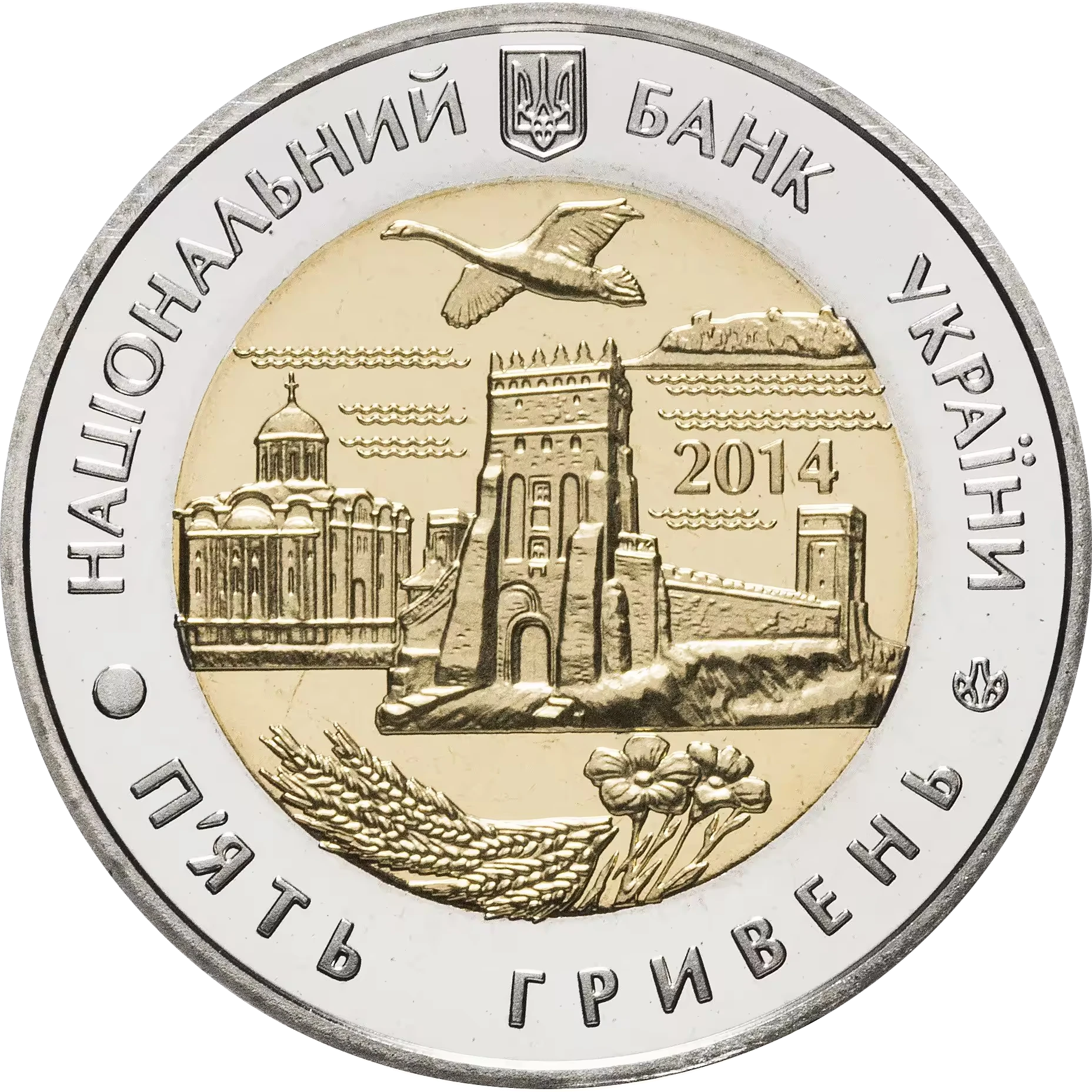 На аверсі монети розміщено: угорі малий Державний Герб України, по колу написи: НАЦІОНАЛЬНИЙ БАНК УКРАЇНИ (угорі), П`ЯТЬ ГРИВЕНЬ (унизу), праворуч - логотип Монетного двору Національного банку України; у центрі - стилізовану композицію: зображення башти Луцького замку, Успенського собору в м. Володимирі-Волинському, острова на озері Світязь, під яким рік карбування монети - 2014, а також лебедя (угорі), колосся та квіток льону (унизу).