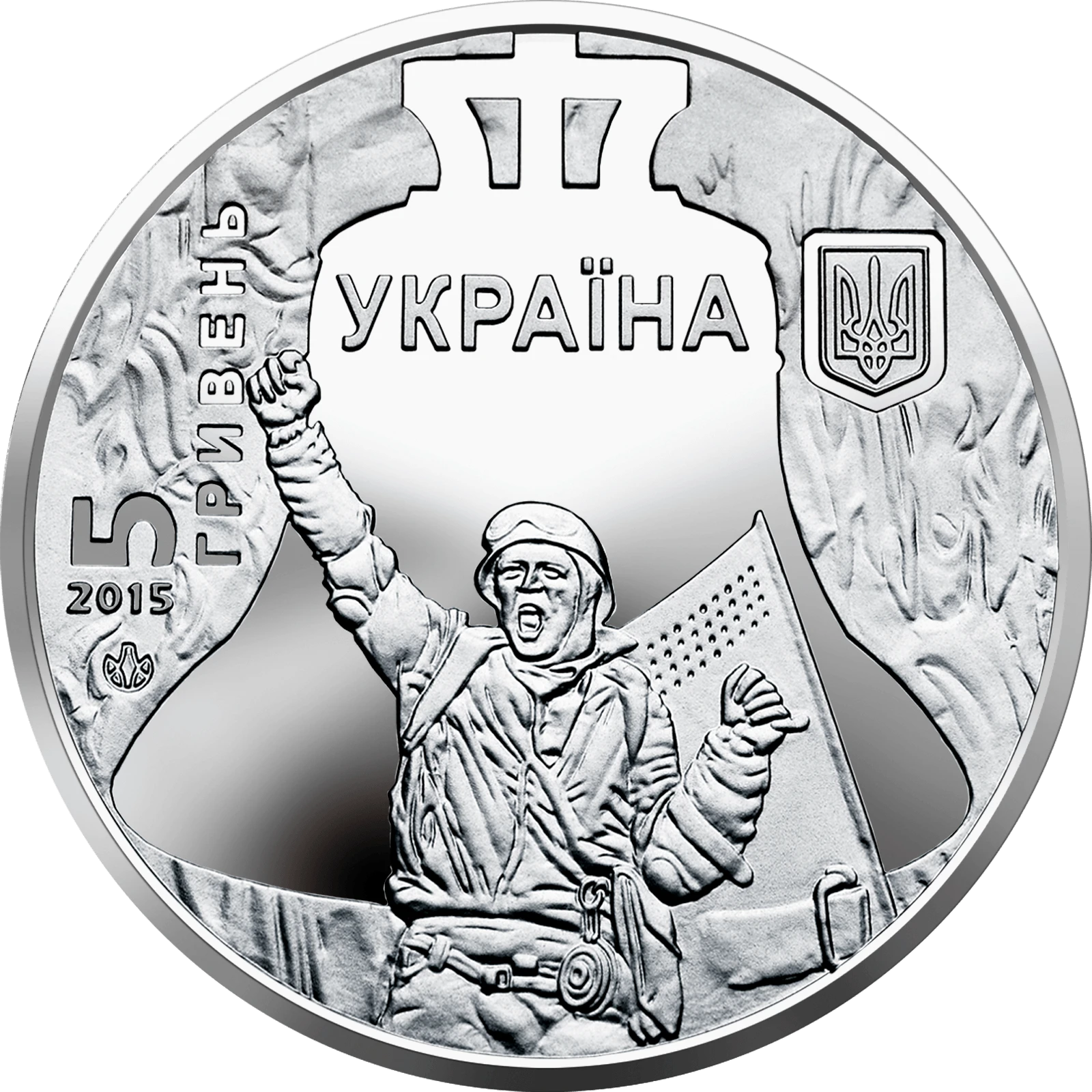 Всі оголошення про продаж монети на нашому сайтіНа аверсі монети на дзеркальному тлі дзвона розміщено: угорі напис - УКРАЇНА, під яким зображено учасника подій; на рельєфному тлі монети у вигляді полум`я розміщено: малий Державний Герб України (праворуч) та номінал 5/ГРИВЕНЬ, рік карбування монети 2015, логотип Монетного двору Національного банку України (ліворуч).