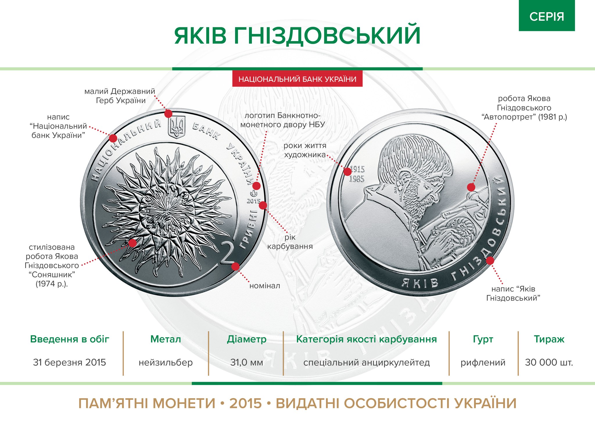На аверсі монети розміщено: угорі малий Державний Герб України та напис півколом НАЦІОНАЛЬНИЙ БАНК УКРАЇНИ, праворуч - логотип Монетного двору Національного банку України, рік карбування монети 2015, номінал 2 ГРИВНІ, у колі - стилізовану роботу Я. Гніздовського `Соняшник` (1974 р.).