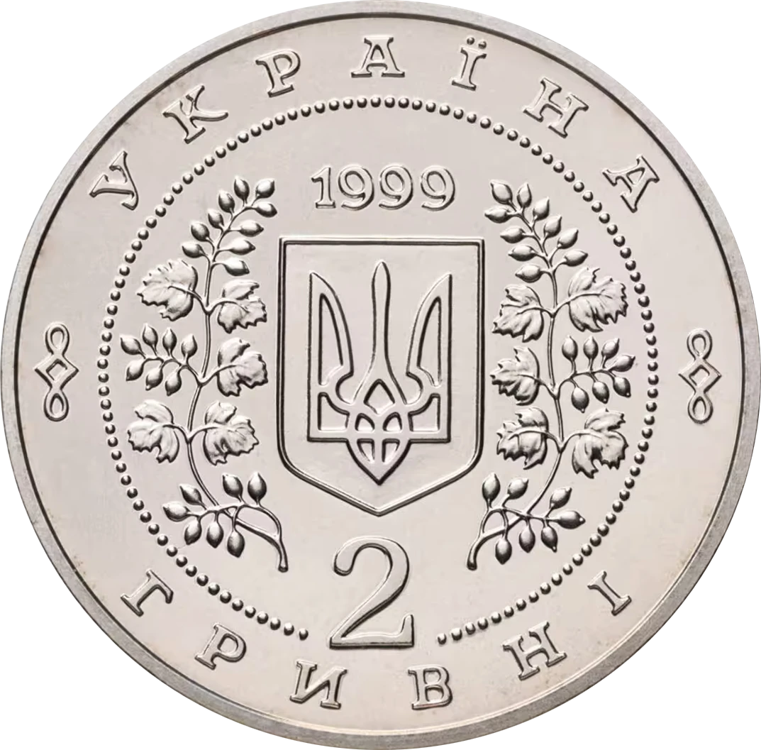 На аверсі монети в центрі кола, утвореного намистовим узором, зображено малий Державний герб України в обрамленні гілок калини та розміщено написи: УКРАЇНА, 2, ГРИВНІ, 1999.