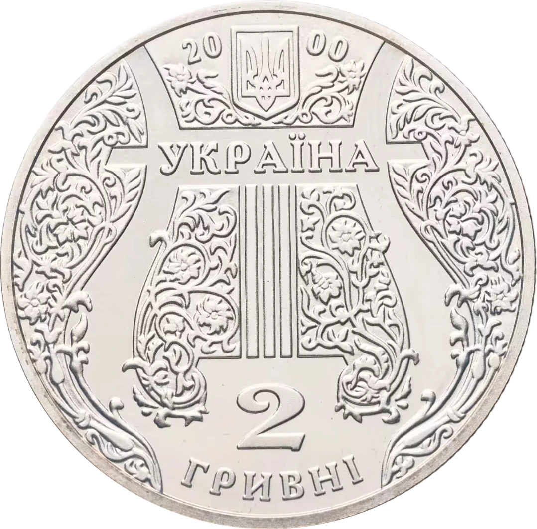 На аверсі монети розміщено дзеркальне зображення ліри на тлі матового рослинного орнаменту та написи: 2000, УКРАЇНА, 2, ГРИВНІ